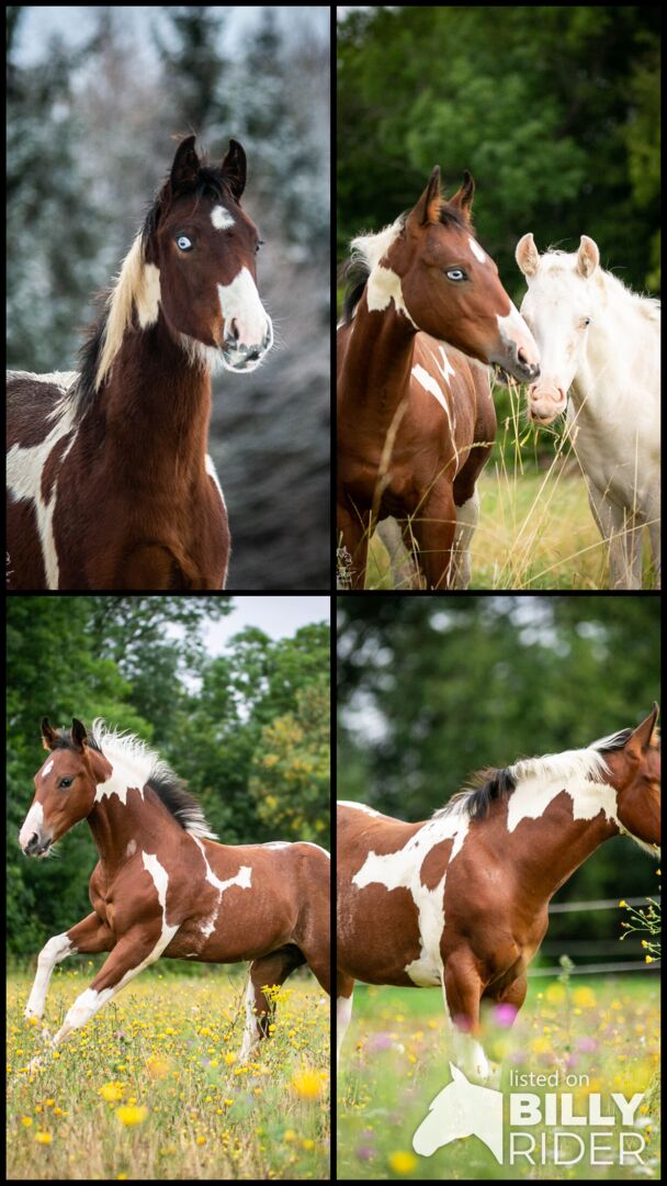 Eycatcher Paint Horse Foal Mare - Hi, I am little Aiana (Indian = eternal flower) and I am a Bay Tobiano filly with one blue eye. I was born in April 2023 and am looking for a loving owner after weaning in December. My dad is Deltagun Peppy MR, a 150 cm tall Paint stallion with the very best pedigree and 100% check inheritance. My mom is Special Velvet Mount, a 1a premium mare. My mom is 6Panel n/n. From day one I have been a real sunshine who wants to cuddle a lot. When I grow up, I will be about 1.50 - 1.52 m tall. I am already a very strong and muscular foal. I am courageous in my approach to everything new and know exactly what I want. I got that from my mommy :) I am growing up in a mixed herd in a paddock-trail setting. So I can run, play and eat as much as I want. I hope it stays that way with my new owner. I don't want to be in a box, not even at night. I could also stay for rearing (from € 300 per month).
