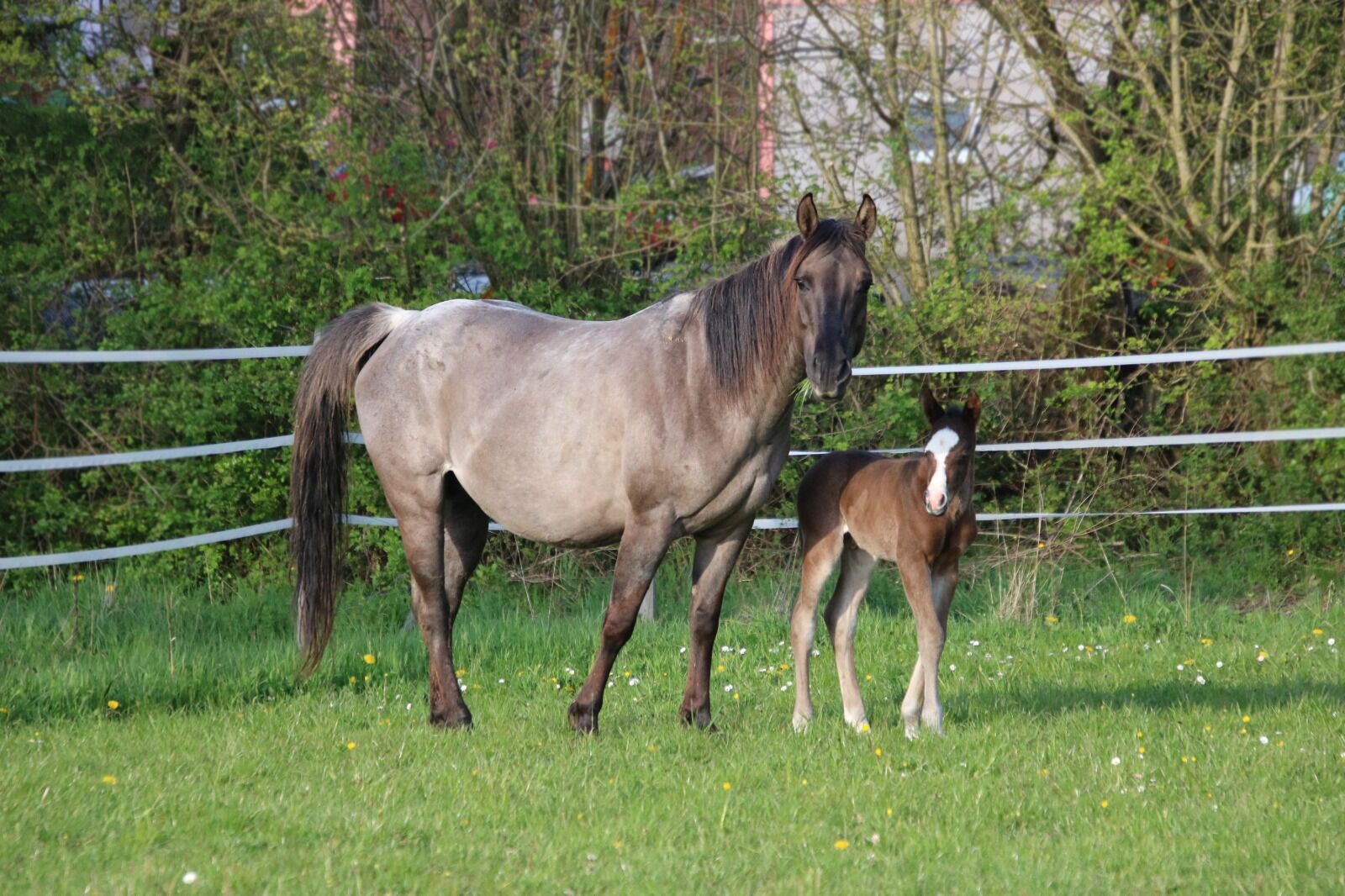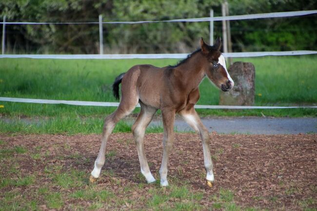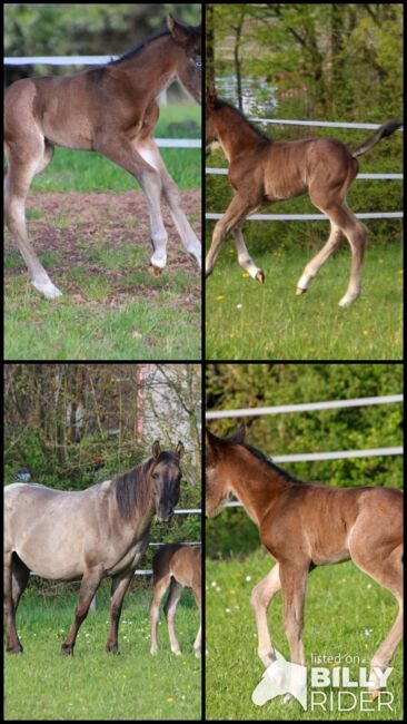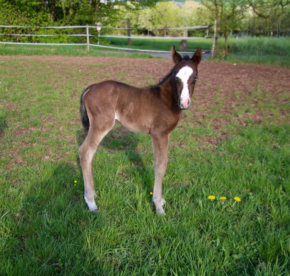 Eye-catcher with quality - QH colt with top potential - Location: 66916 Breitenbach BE My Blue Ice, born on 15.04.2026, is a beautiful Quarter Horse colt in the color Bay with an expected final height of approx. 147 to 150 cm. With his extraordinary markings and expressive appearance, he is already a real eye-catcher. He impresses with his correct, compact and strong build and very good muscling. His movements are loose, elastic and naturally athletic - the best prerequisites for a later career in reining or all-round sport. BE My Blue Ice has a particularly pleasant character: friendly, cuddly, cool and always easy to handle. He grows up in a herd with other foals and is handled regularly so that he has mastered the foal ABC by the time he is handed over. His very good reining and all-round pedigree (Spooks Gotta Gun x Joe Cougar Hancock) makes him highly interesting for ambitious show riders as well as for the upper leisure sector. Health and breeding are top priority - he is vet checked, presented to the farrier and regularly wormed when he is sold. He will of course be sold with AQHA papers and an equine passport. A youngster with quality, charisma and the best character - ideal as a future sport or leisure horse with prospects.