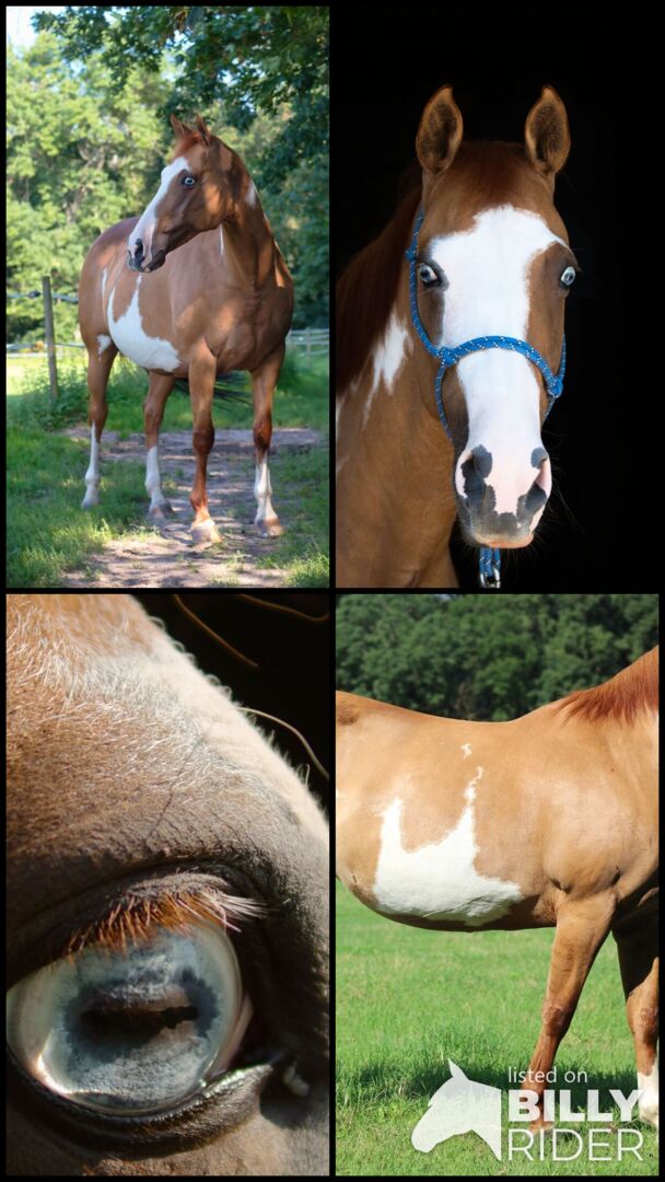 Eyecatcher with 2 blue eyes - With a heavy heart due to absolute lack of time, this beautiful mare is looking for a new, forever 5-star home. She was born in 2010 and is 151 cm tall. Blue is a Paint Horse Mix mare without papers. She stands out due to her great markings, her color (red dun-overo) and her two blue eyes. Blue has a lovely character and is very person-oriented, therefore not suitable for constantly changing riders. The mare is very easy and fine to handle, stays with people and is very fond of children. Blue knows open stabling and box stabling. She can only stand together with lower-ranking mares in the herd. Always fit so far. She is unspent, as she was only broken in at the age of 10. She was previously a broodmare. Blue was ridden western for leisure and is great in the field. If she trusts her rider, she is an absolutely reliable horse. She is also ideal for less advanced riders. Due to a lack of time, she has not been ridden for the last few weeks. Blue will only be given to the very best hands, where she can spend the rest of her life. Location: DE-04178 Burghausen