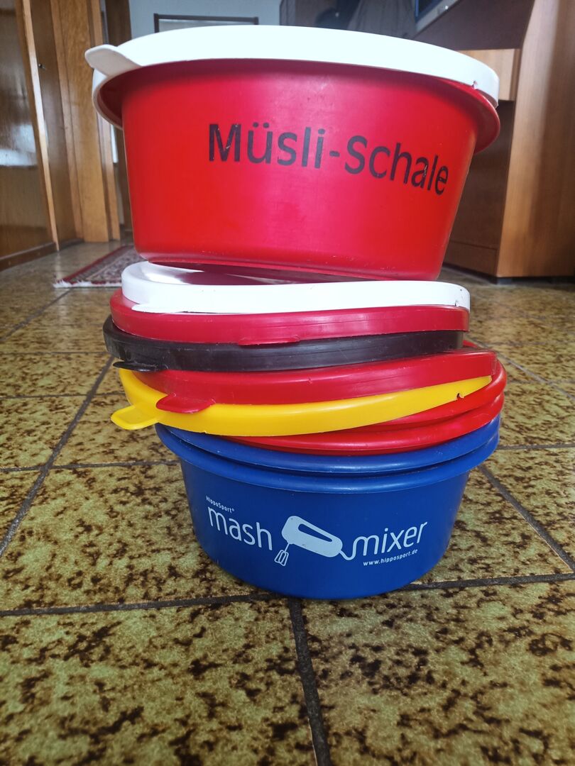 Feeding bowl set - 5 times 5l feeding bowl/muesli bowl with 7 lids - For sale are several 5l cereal bowls with lids: - a hardly used red bowl from deukavallo with white lid,