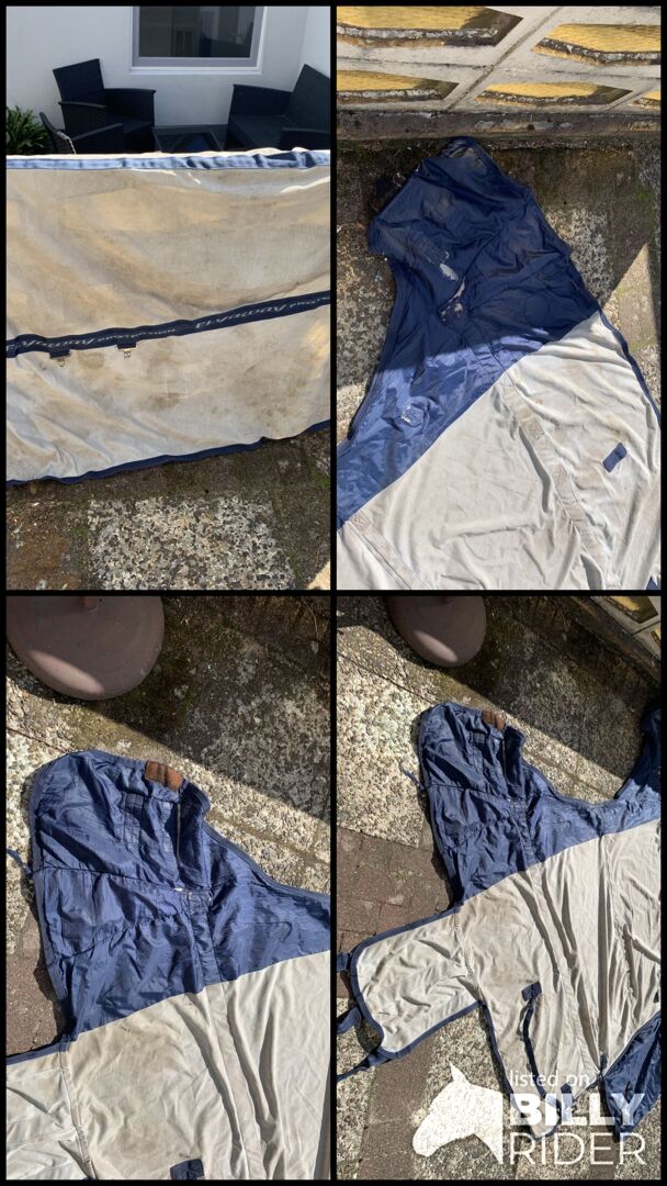 fly blanket - I sell this fly rug in length 135cm with belly bib and neck piece. The neck piece is in top condition. The blanket has a tear in the back left and front inside ( see pictures above). The blanket is fully functional.