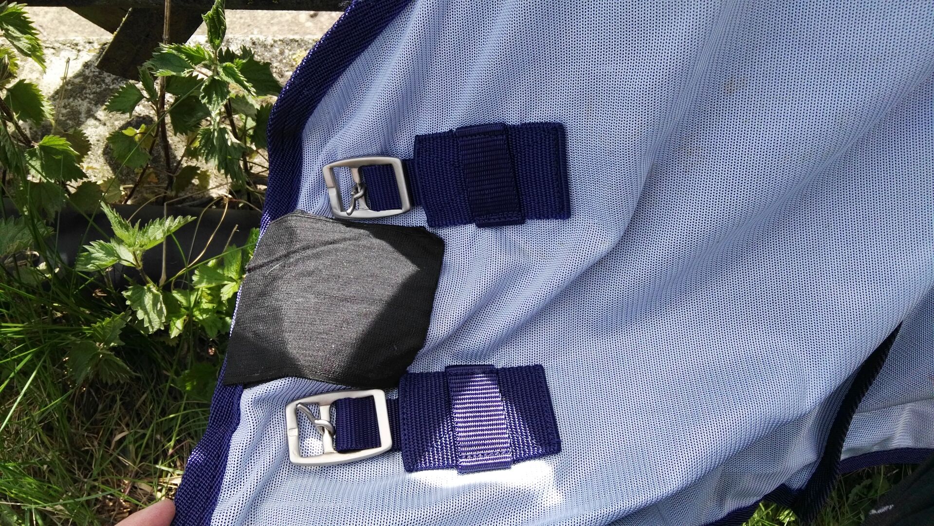 I am selling here a blue, used fly blanket in size 145. The blanket has a removable belly bib. The bib is attached with jeweeils on each side three attached T-clasps. The length of the belly bib is adjustable. In the chest area the blanket is closed with two buckles. In addition, a Velcro fastener is attached to close the chest area. My mare wore the blanket in the pasture, so that there is dirt on it which unfortunately can no longer be removed. Furthermore, a seam is torn on the inside in the chest area (see picture), but this does not affect the use of the blanket.