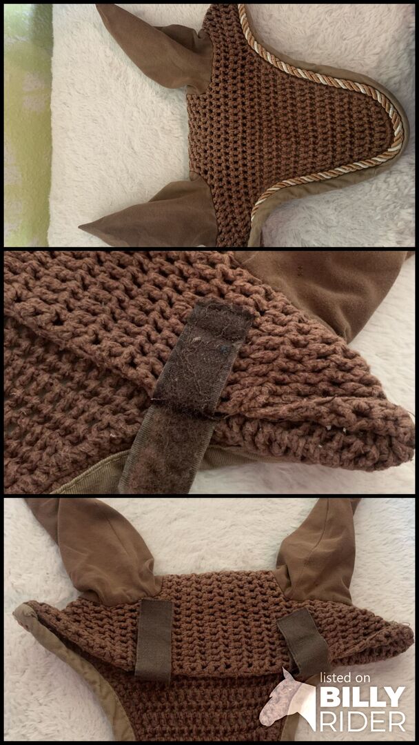 Fly hood brown with gold/silver cord - I give a very nice fly hood, which stands out due to the gold / silver drawstring. The hood can be additionally attached to the bridle by two Velcro. Through more frequent use, the Velcro is already worn ( picture 3).