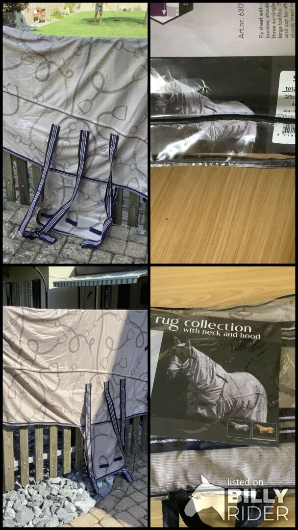 Fly rug QHP new 135 - New fly rug (was only to try on the horse) QHP with removable neck part belly bib with 3 straps, painted, tail bib in the color beige brown with blue edging and leg cords new price 119 Fr.