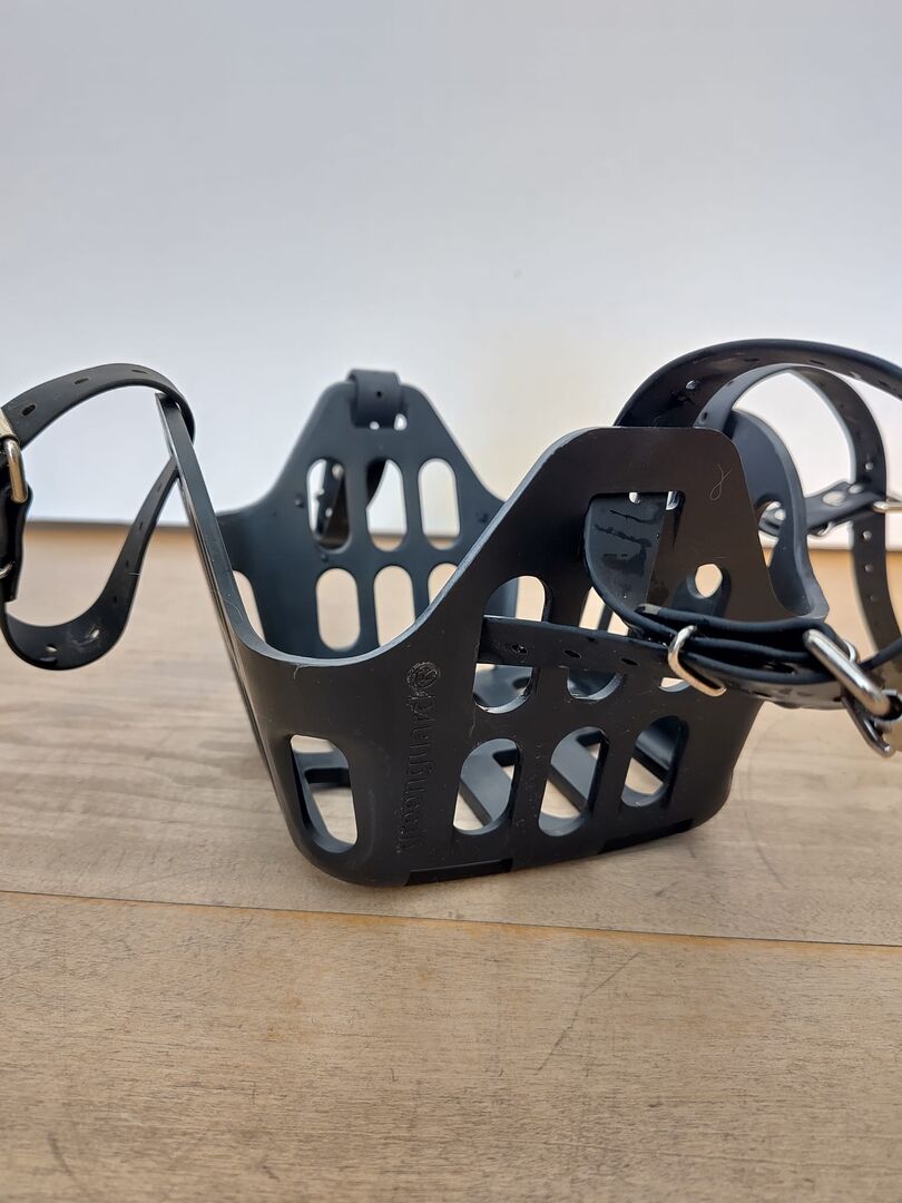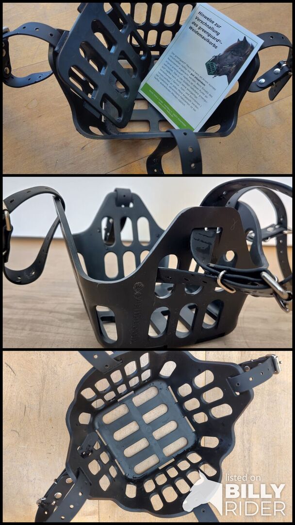 Greenguard muzzle / feeding restraint WB - At the start of the grazing season I am selling my unused Greenguard muzzle in black, size WB (approx. 13/14 cm/side) including Greenguard insert plate WB soft. The muzzle has only been tried on once. Unfortunately I had to realize that our drinking troughs are too small. (It is important to know that the Greenguard muzzles are made of inflexible plastic, so they are certainly much more robust than other muzzles, but they cannot be crumpled).