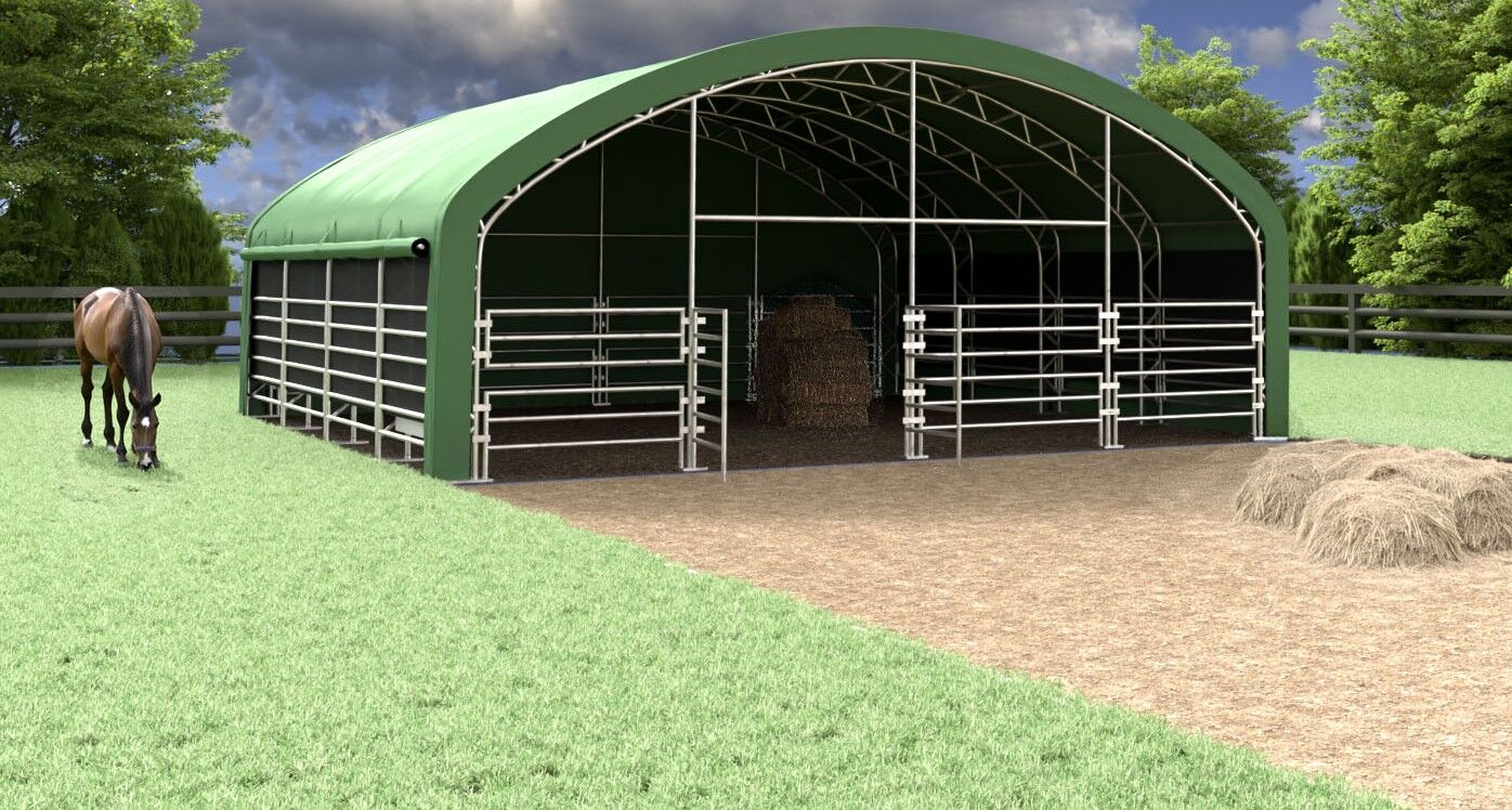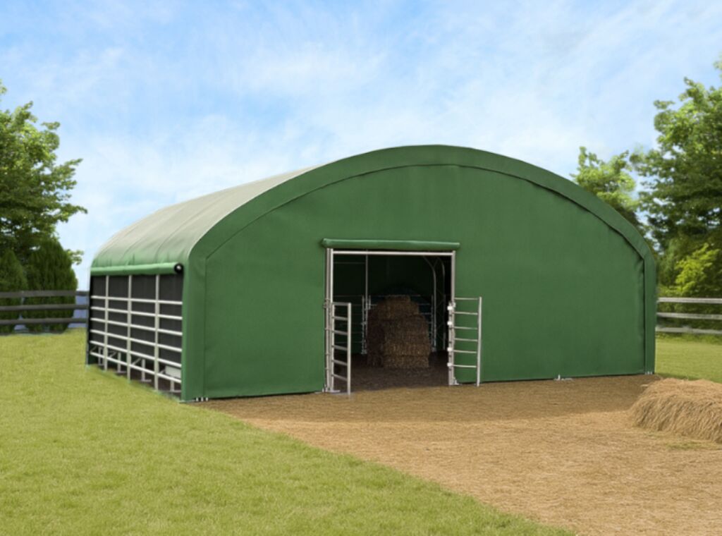 Vorteile auf einen Blick: großzügige 10x10 m Nutzfläche, Premium-Ausführung für den ganzjährigen Einsatz, robuste PVC-Plane 900 g/m², UV-Schutz 50+, hohe Reißfestigkeit, stabile feuerverzinkte Stahlkonstruktion mit doppeltem Traversenrahmen, hochrollbare Seiten für bessere Luftzirkulation, sehr viel Platz für größere Herden, schnelle Montage, mobil und flexibel einsetzbar, ideal als Unterstand, Fressplatz, Ruhebereich oder Lagerfläche.