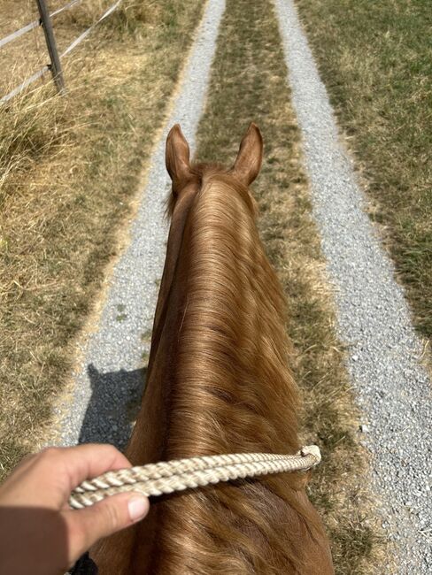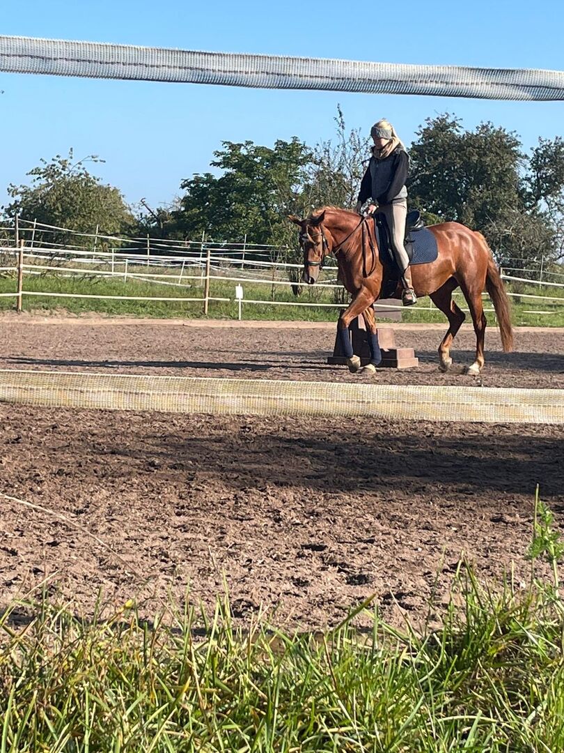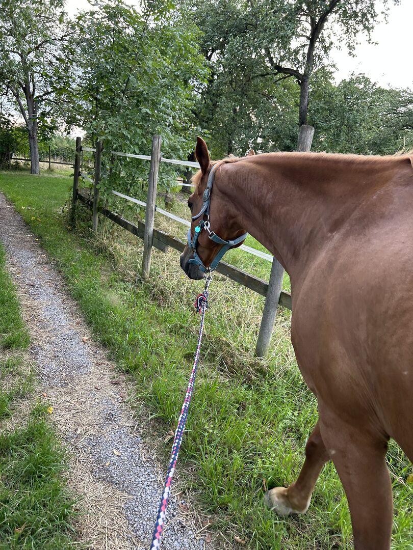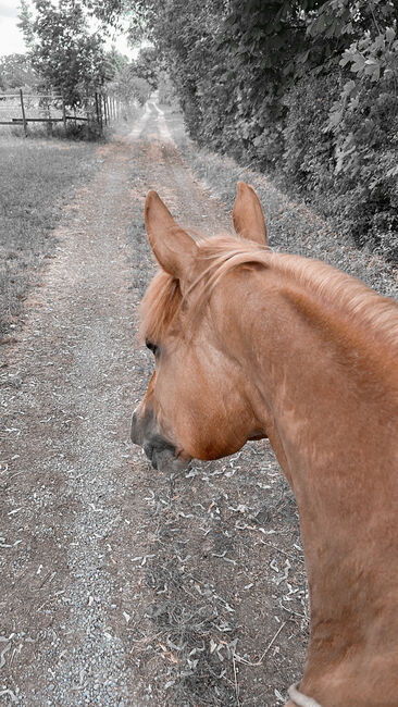 She enjoys going cross-country - both at a quiet pace and at a faster pace - and is generally courageous and motivated. She needs consistent, clear leadership when riding alone, but then she is reliable and can be ridden without a saddle or bridle without any problems. In the arena, she is rather calm and cooperative.