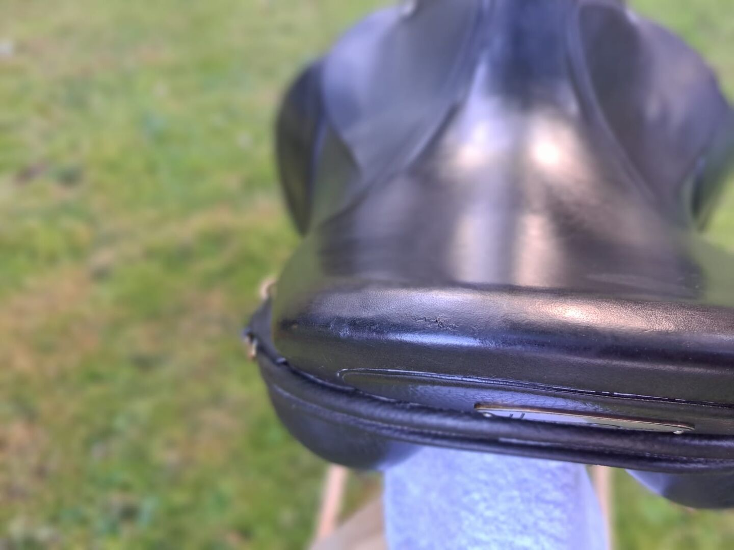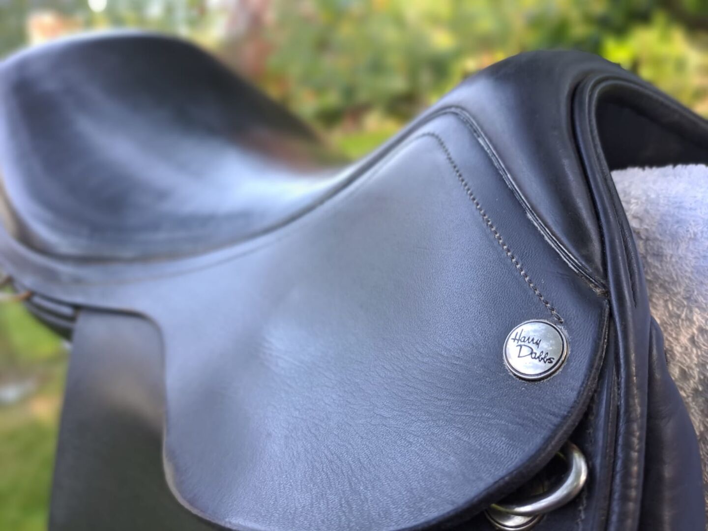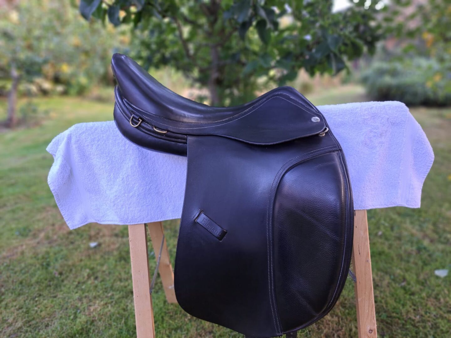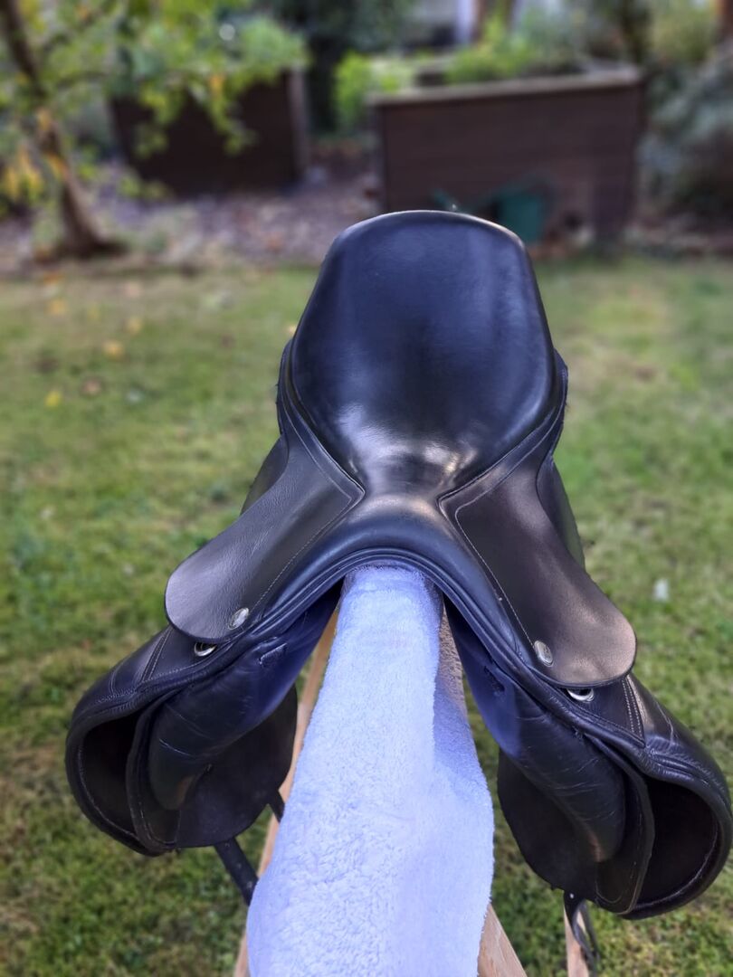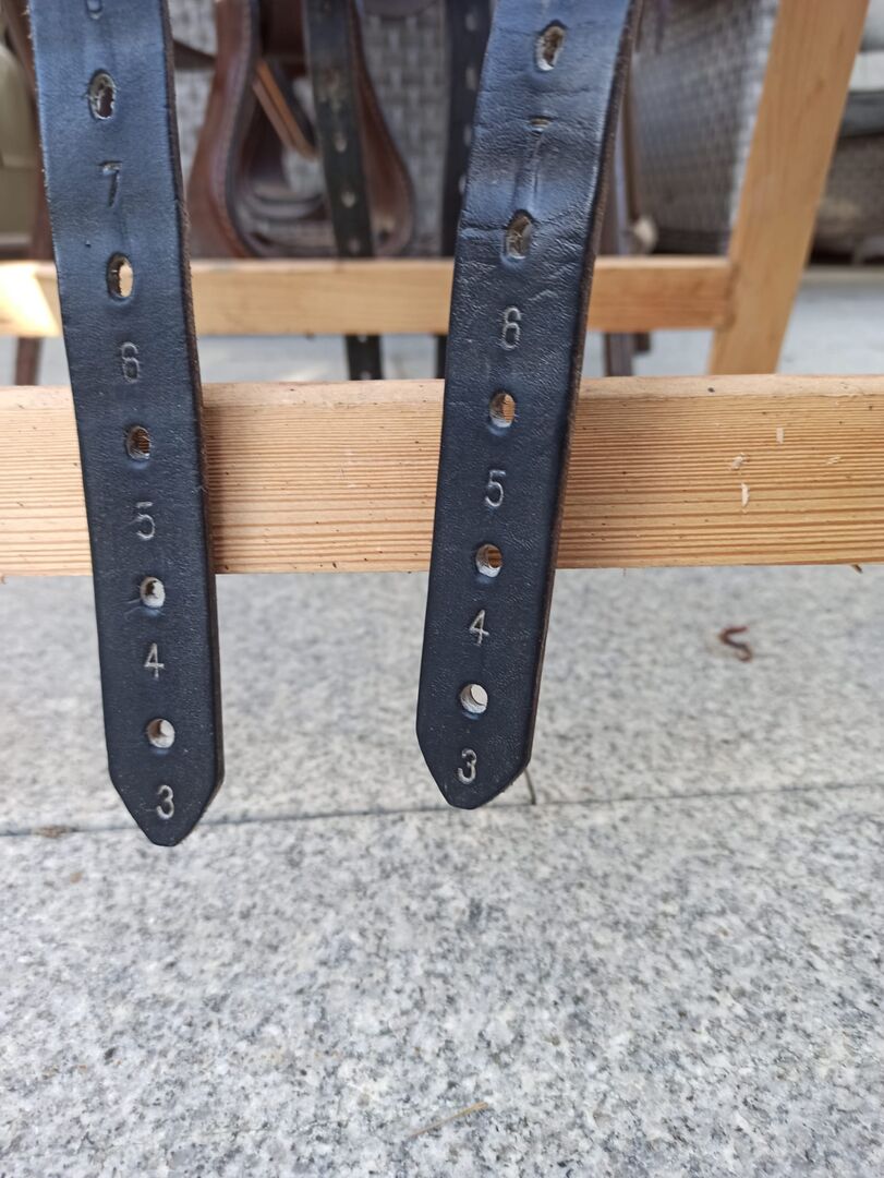 Harry Dabbs Dressage Saddle Elegant - I sell here my used dressage saddle. I bought it used last year and now give it back because the center of gravity of the saddle does not fit my pony. The saddle has a 17.5 inch seat and the gullet width should be 32 (because it fit this saddle and our current one also has 32). There is a preparation for velcro thimbles on the saddle, if necessary two velcro thimbles of our summer saddle can be added. At the saddle rim, the leather unfortunately has a small quirk (see photo). The previous owner shortened the girth straps (see photo), one strap was renewed by the saddler. The saddle was last padded in November 2022. Otherwise, the saddle has of course signs of use, but I sell it only because it does not fit one hundred percent.