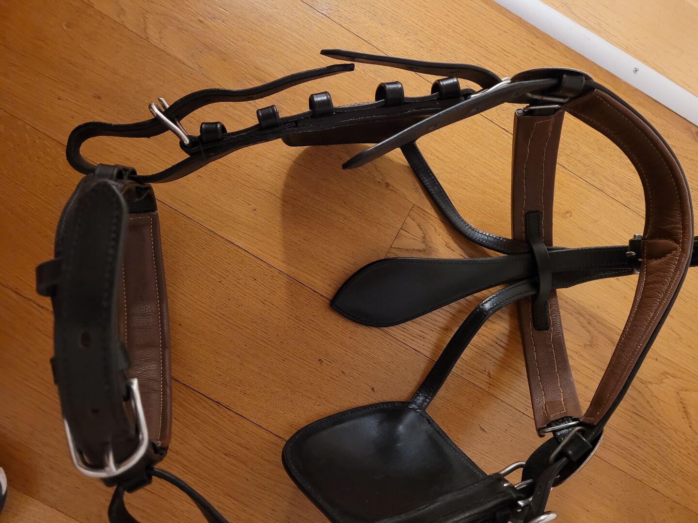 Head frame Cob / Thoroughbred black-brown - New head frame, only been on the horse for fitting. Was too big. very nice soft leather, anatomically shaped neck piece black, light brown lining