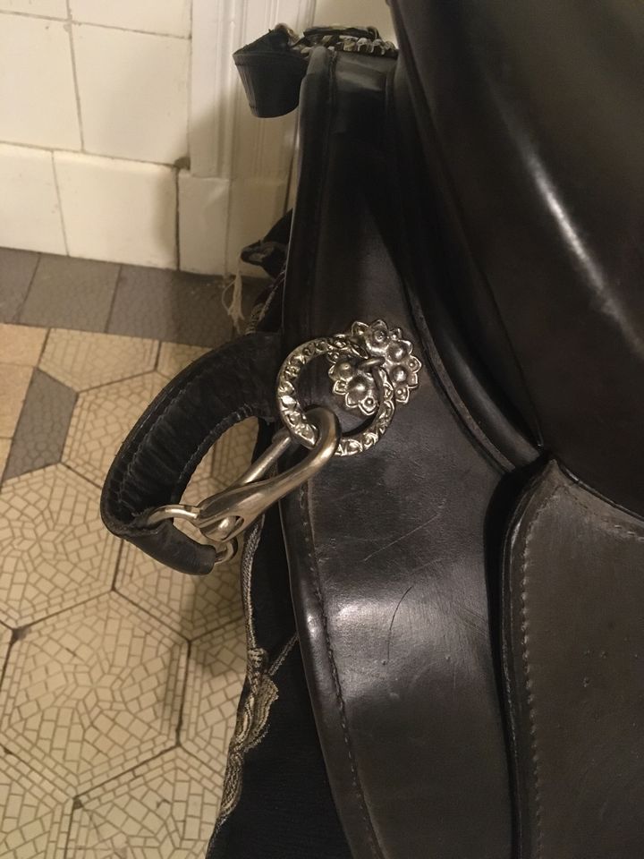 Hidalgo Relvas baroque leather tree black 18" wax leather - Hidalgo Relvas with leather tree, 18 inch, flat seat, used but in good condition and fully functional, with baroque chrome-colored fittings, two breastplate rings per side. This saddle has no gullet plate, so it can adapt to many horses, and it is ridden with Velcro panels. The Velcro panels in the photo are dressage panels, felt-reinforced, and have a length of approx. 44cm and a thickness of 4cm-3cm-3cm, flattening from front to back. I also have a set of felt-reinforced dressage pads, 4cm thick throughout, also approx. 44cm long, and a set of felt-reinforced dressage pads, 3cm thick throughout and 46cm long. The felt-reinforced version is both more durable and recommended for slightly heavier riders. All panels are flattened at the front of the shoulder. Spanish Velcro panels could also be used with this saddle. The saddle in this offer comes with ONE set of panels of your choice. The 44's with 4cm thickness have never been ridden, the 46's very little, the 44's 4-3-3 the most, but even these are still in very good shape/not sagging due to the felt reinforcement. The thick wax leather is not sensitive to rain and has always been treated with the appropriate care product, so it is supple. The saddle has signs of use as it was ridden a lot, see photos, was on a round-ribbed Connemara mare.