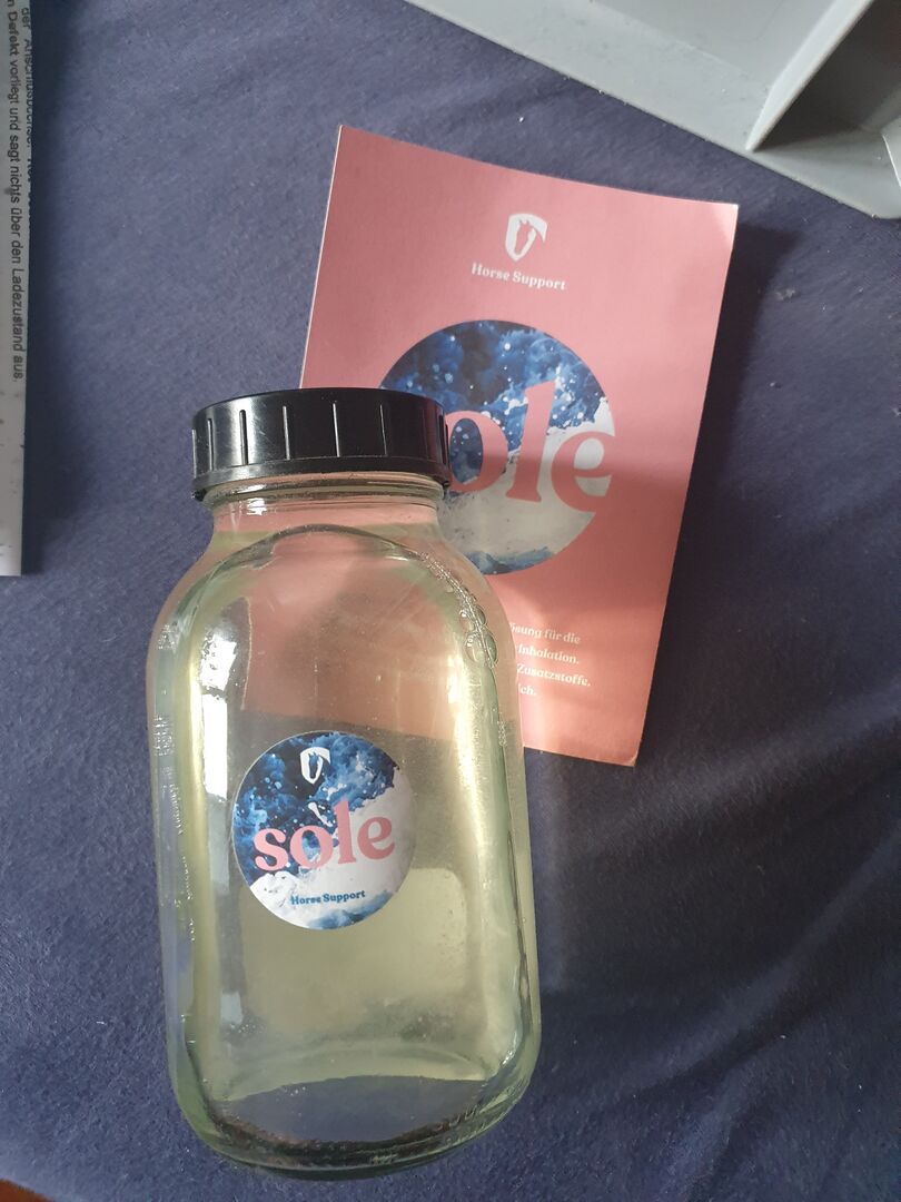 The inhaler comes with 13 cups, 1/3 contact liquid, 1 bottle of distilled water, disinfectant as a concentrate, 1/3 bottle of NaCl and high-quality North Sea sole from Horsesupport.