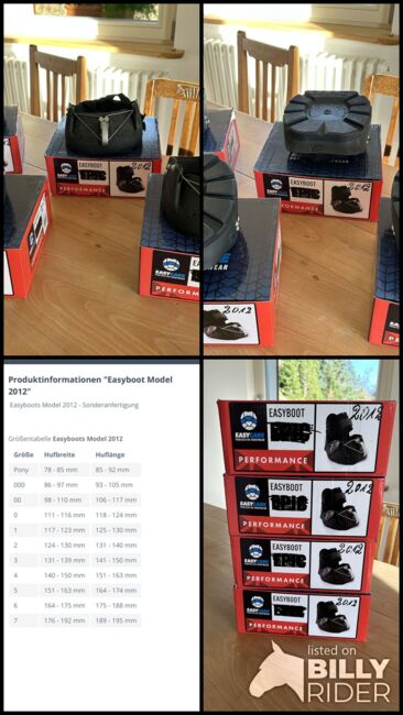 Hoof boots Easyboot Performance 2012 size 6 - I am offering 4 Easyboot Performance 2012 hoof boots. The shoes are brand new, have only been tried on once. It is size 6, I attach the size chart in the photos. Unfortunately they did not fit. The Shoes make a very high quality stable impression, the front closure is adjustable and sits bombproof. An invoice is still available, I paid € 104,- per piece and would like to have € 75,- per piece for them. I will be happy to send you more photos on request.