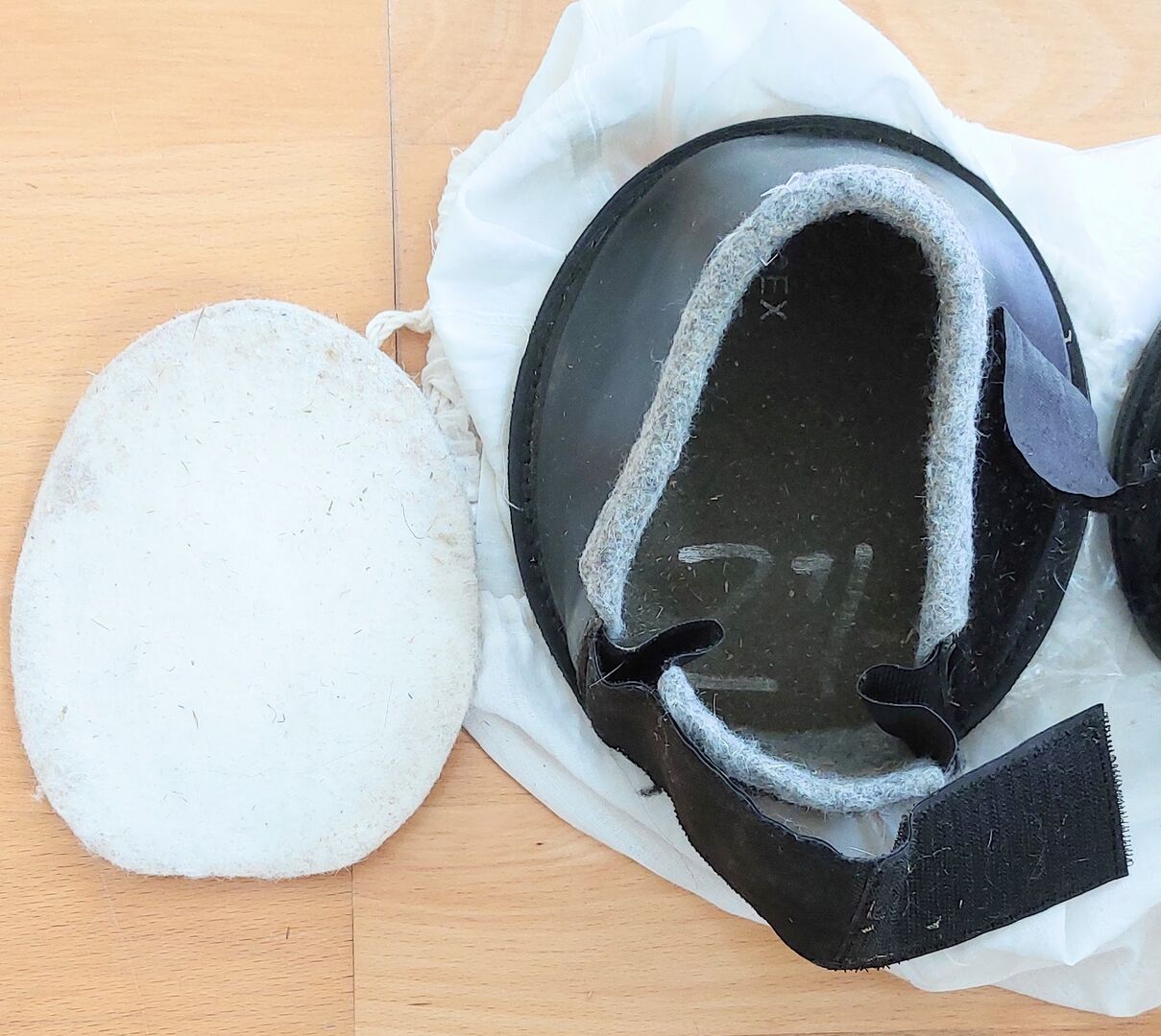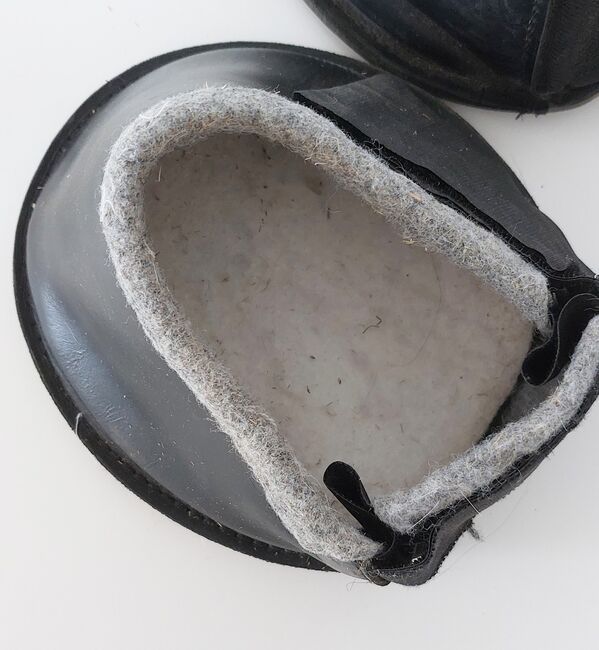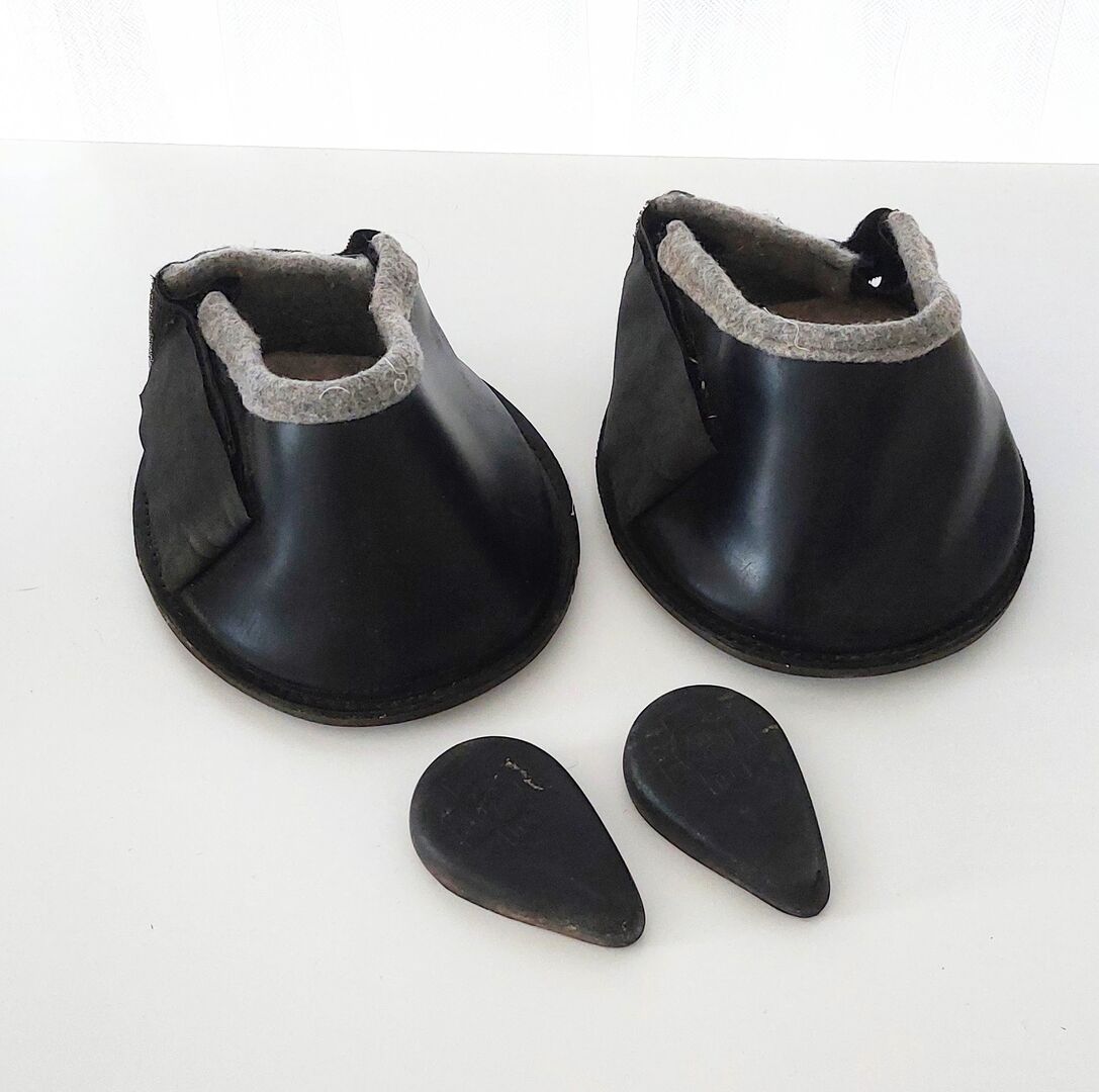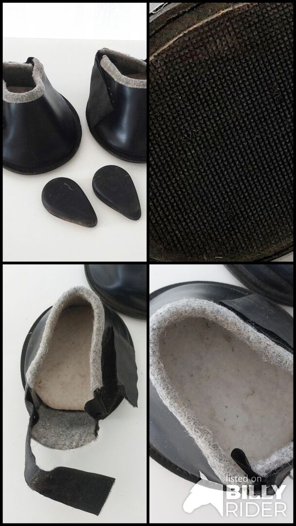 Hoof boots Engl - The optimum shape makes it easy to put on the hoof boot, even if the horse has to wear a hoof bandage. This makes normal movement and paddock walking possible. The folded cut prevents dirt, mud or stones etc. from penetrating and slipping between the sole of the hoof boot and the sole of the horse's hoof. The 10 mm thick rubber sole protects against punctual pressure (gravel runs, roads etc.) In addition, a 12 mm thick felt insert can be inserted into the shoe for further cushioning. The hoof boots can also be left on the hoof for longer periods of time, thus avoiding the need for hoof bandages or plaster shoes. Size: WB (measured inside) 17x14cm, (measured on the outside) 18.9x16.5cm Height of the shoe at the front of the hoof 11.6 cm The shoe can be easily adjusted thanks to the wide Velcro fastener. In very good condition!