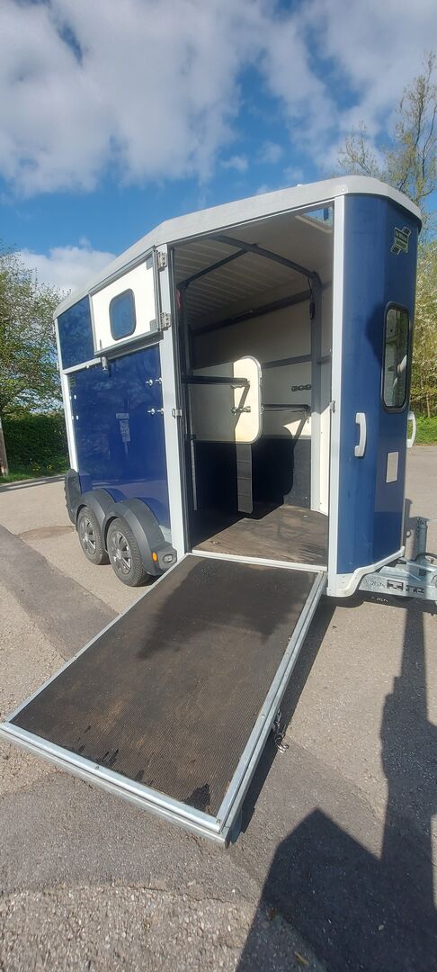 Horse trailer Ifor Williams HB 506 2s horse trailer - Rarely used Ifor Williams HB 506 2 horse trailer in blue. BJ. 08/2014, TÜV 04/2025 without defects. Ramp/door system, Knott coupling, loading by forklift possible. 100 km/h registration. Front exit right, stand supports, lockable ball-head lock, aluminum floor with 12 mm rubber mat, partition removable, LED interior lighting sep. switchable, both sides. LED loading lighting at the rear, ideal in autumn/winter. Roof ventilation, plastic mudguards. Dimensions: 4.30 m long /2.13 m wide / 2.75 m high (inside 3.16/1.67/2.26). The price is VB, inspection in Aachen.