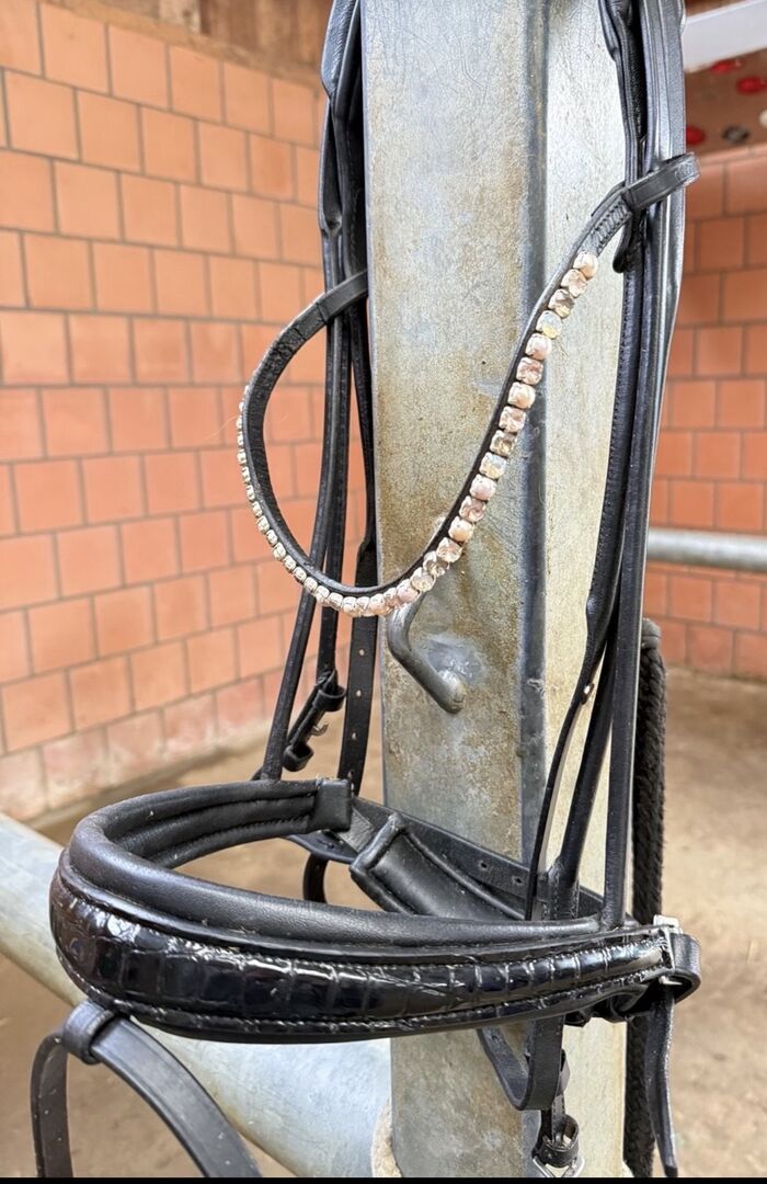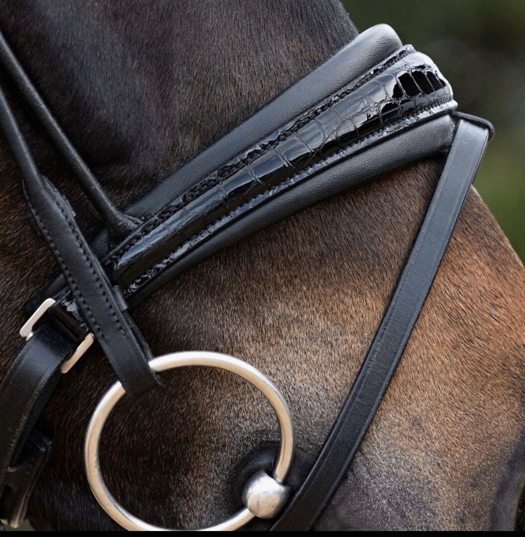 The bridle impresses with its elegant finish: - Noseband with croco-lacquer look - Round-stitched design for extra comfort - Without reins and without browband