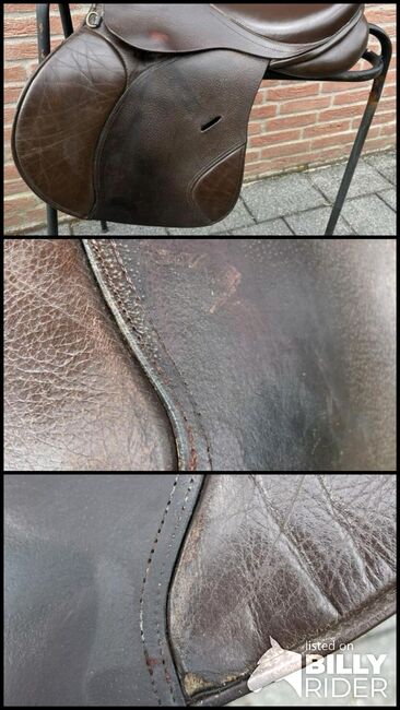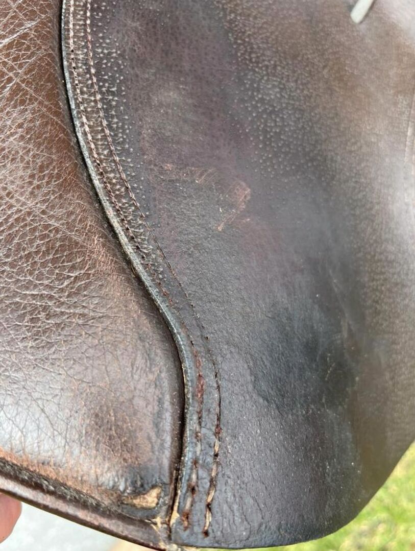 Used but in good condition. At the knee hocks at the bottom slight damages (see pictures) but the saddle itself is 100% in order.
