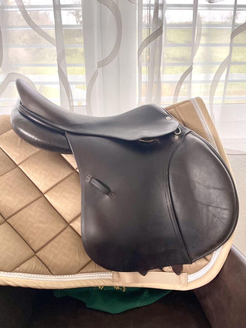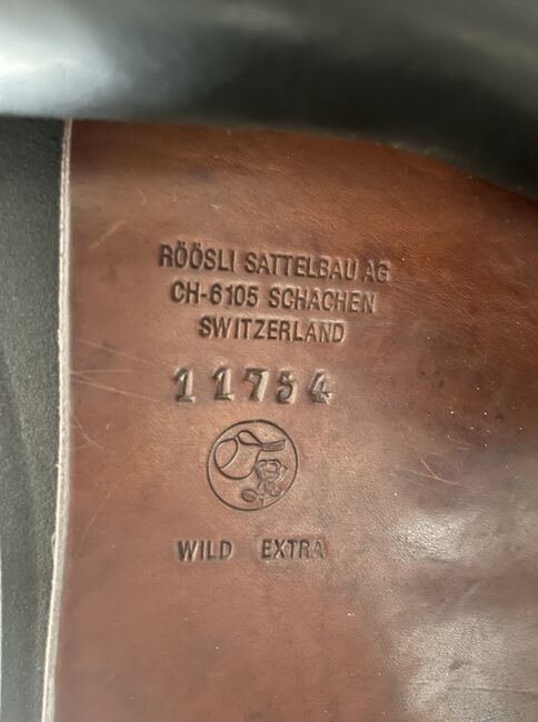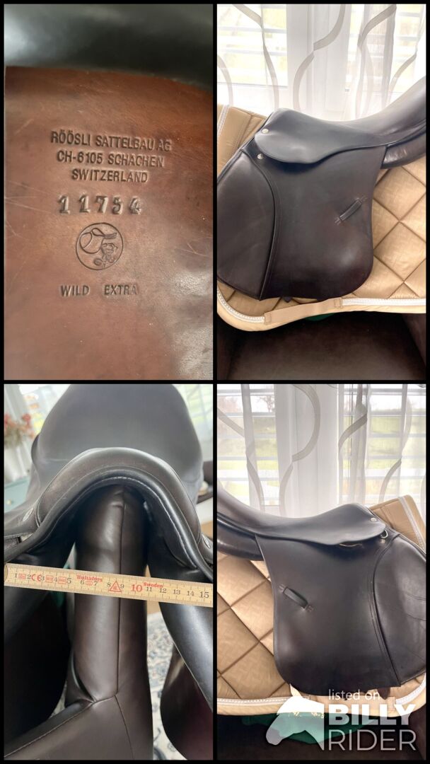 Jumping saddle Röösli - Very nice jumping saddle in dark brown, model Extra Wild, 17 inch, from Röösli Sattelbau for sale.