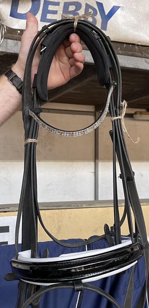 Kavalkade patent snaffle - Well maintained, white backed Kavalkade snaffle that buckles at the neck and is backed with a neck pad.