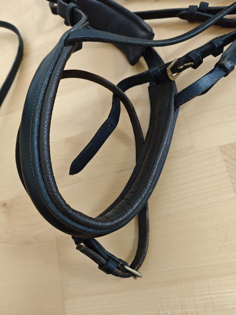 Kieffer snaffle WB - I am selling a very good condition Kieffer snaffle including reins in size WB. The bridle has black stones with gold-colored decorations on the browband. The leather is black and brown.