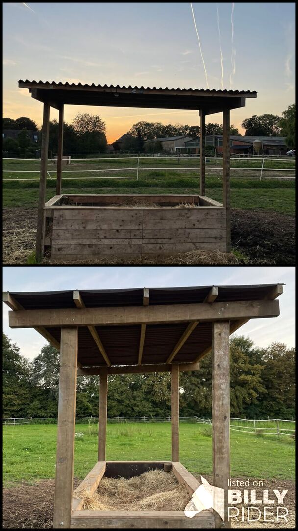 The hayrack stands on thick wooden feet and is very sturdy. Dimensions 2.55X2.75m and 2.85m high. Only self-collection!