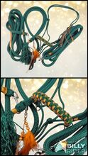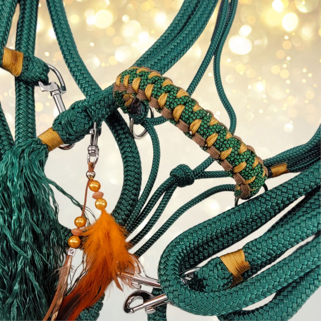 Large set of sidepull reins Leadrope neck ring COB - The Jade set comes from Freespirit Horse Art and is handmade. A wonderful set in gray-green, black, beige and gold. Set consisting of sidepull with decorated nose in JADE design in three colors made of paracord. The set also includes reins, neck rope and 3.7 m lead rope. Knotted halter 6 mm thick. Reins, lead rope and neck ring 12 mm thick.