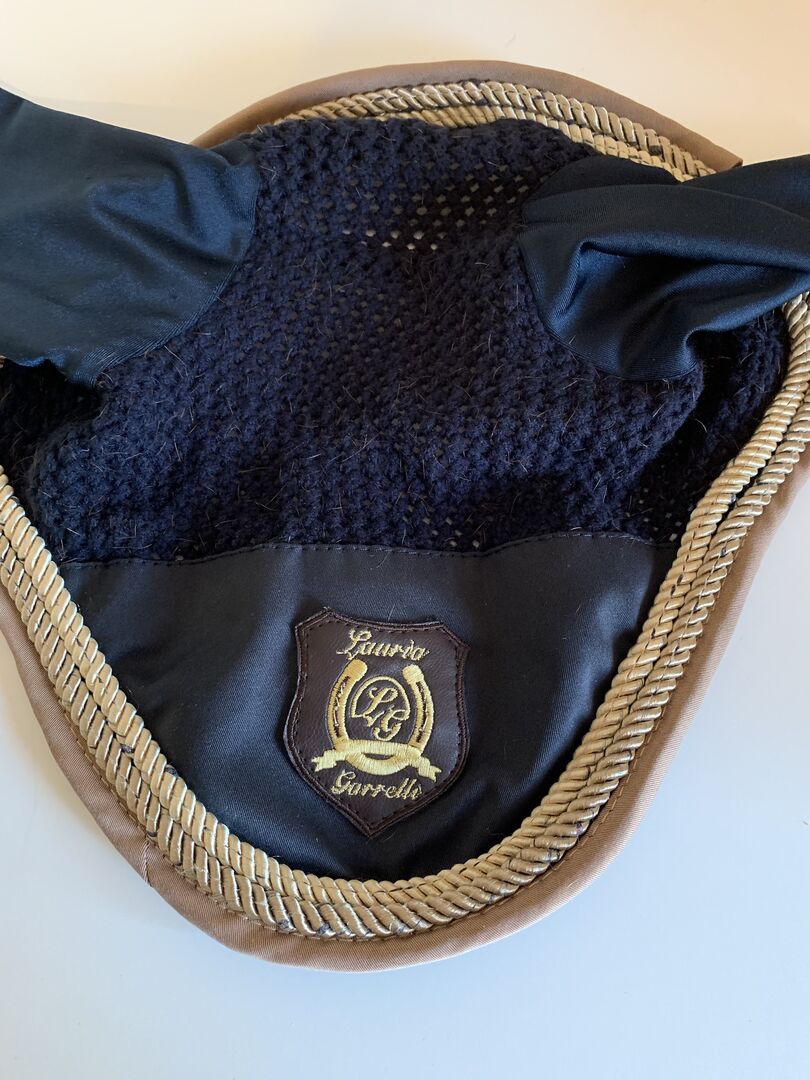 Laurria Garrelli golden Gate fly hood blue ,Warmblood - Sell my very well preserved fly hood from Laurria Garrelli in size warmblood. My horse, see photo, it fit very well.