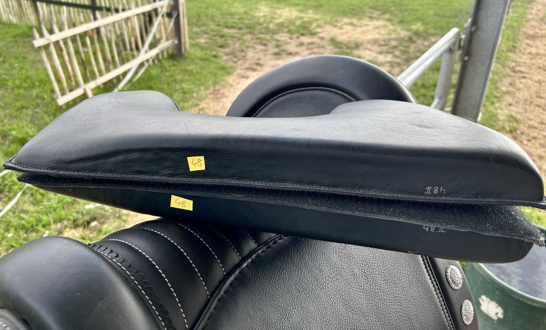 Leather tree saddle Hidalgo Sanluca seat size 35cm - The saddle has only been on my horse about three times and is now being sold because I have given up riding. The original price in mint condition was just under € 1,600. The condition is documented in the photos. Any questions will be gladly answered. Grandeur saddlecloth in mint condition and other accessories can be taken over for a fee (price is without accessories!). The price of course includes the saddle cover and an additional set of Velcro panels (for heavier riders). The saddle will not be lent out for testing. The shipping costs are approx. 20,- €