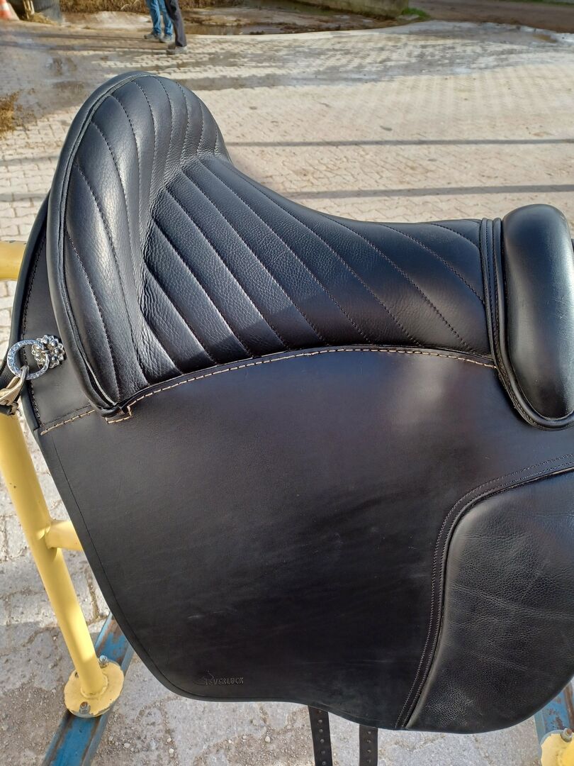 Leather tree saddle "Isabella" by Everluck - Manufacturer's description: "Our Everluck Isabela is part of our premium line and is a classic Spanish saddle. This model is also ideal for horses with a lot of withers and is the perfect all-rounder. Thanks to its incredibly softly padded seat, the pleasantly narrow seat and the Velcro knee rolls, this saddle is ideal for all types of leisure riding. With it, gymnastics in the riding arena (even including small jumps) and long cross-country rides are no problem. Loops (D-rings and carabiners) are attached to the end of the saddle, allowing stirrups to be hung up neatly without scratching the saddle, and saddle bags or similar can also be attached easily. New price from 2500€" The saddle was bought new in summer 2022 and shows slight signs of use. Due to the leather tree, the saddle adapts easily to any horse's back.