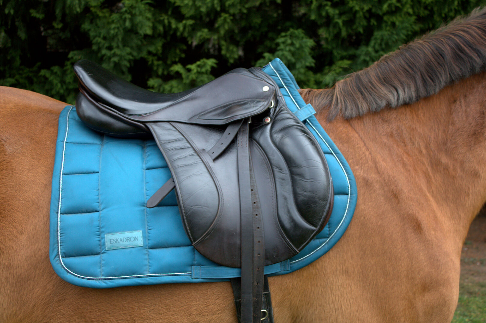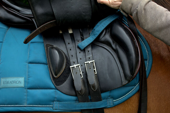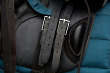 Stirrups and stirrup leathers are included.