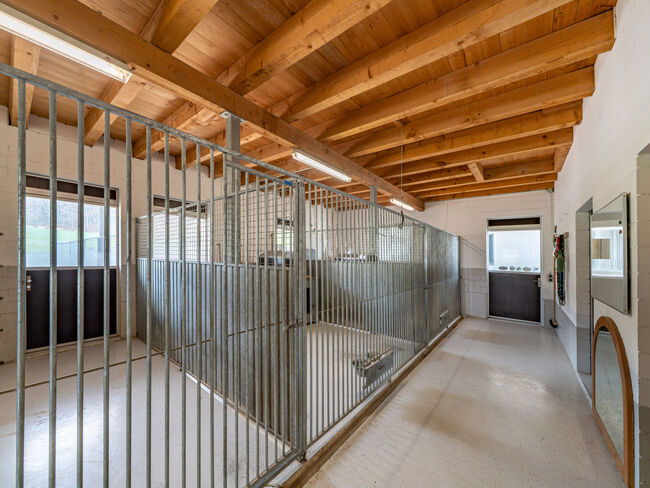 In the annex you will find four spacious horse boxes, including a run. Four further boxes, which could be converted into horse boxes, are currently used for licensed dog breeding. Above the boxes is a very spacious hayloft, which is ideal for storage. There is also a large exercise area in the immediate vicinity of the stables.