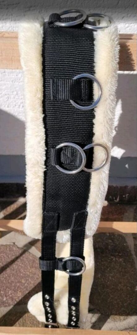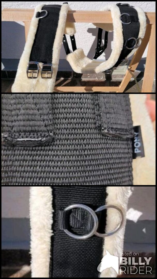 The girth is black and white and has the following features: - Soft white padding for the comfort of the pony - Several sturdy metal rings for different lunging options - Adjustable buckles for optimum fit - Rustproof metal parts