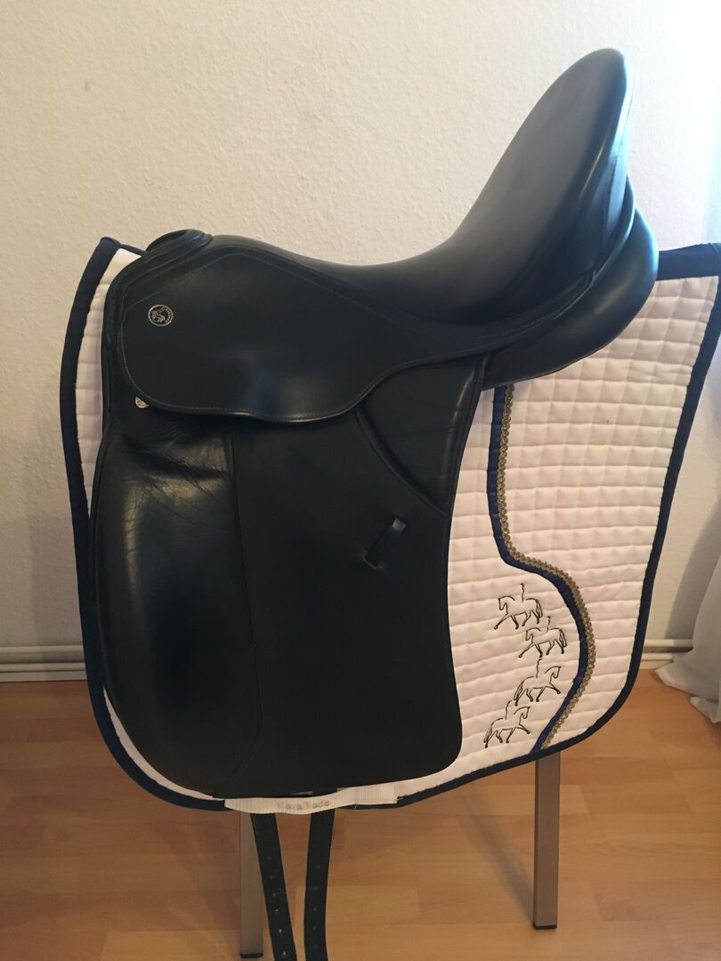 Lusitano dressage saddle - Sell my super comfortable Lusitano Exellent dressage saddle by Kieffer in 17.5 inch, medium KW. The saddle has a pleasantly deep seat and has soft pronounced rolls for a perfect fit. It has long girth straps in a V-suspension. Optimal for a short straight or slightly curved back line. The saddle is adjustable and is in a neat condition and has only been checked by the saddler.