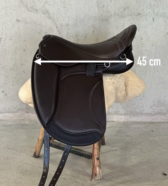 Manufacturer: Jeremy Rudge Saddlery England Model: Contour with pony tree As good as new demonstrator (12/2024), ridden approx. 5 times Color/leather: Deep dark brown doubled Padding: Sheep's wool Special features: Sophisticated horse-friendly mono flap design - panels sewn to the saddle flap, integrated gullets - no irritating edges or exposed straps on the horse's body. Soft knee position, no knee rolls - for a direct, free riding feel in the style of a western saddle Extras: embroidery in the seat, D-rings, protective cover Ideal back shape: straight to slightly curved Price: €3,990 incl. VAT (new price: €6,900)