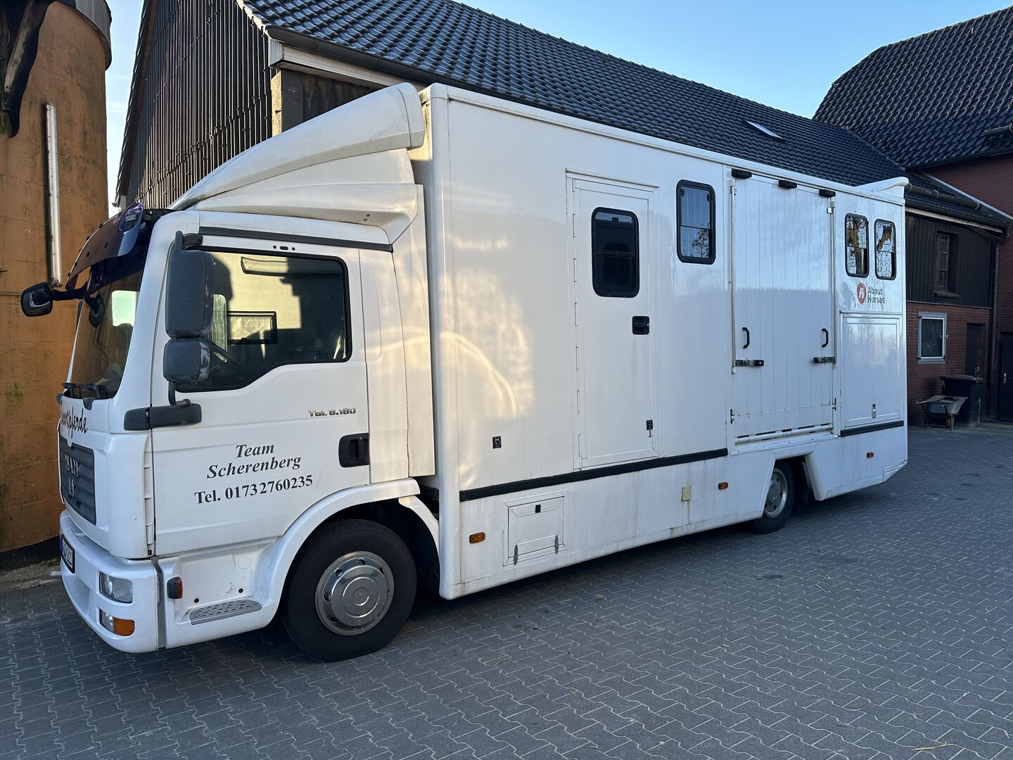 MAN horse transport truck for 5 horses with small living compartment - MAN horse transporter with 4 sliding partitions for 5 horses TÜV new from 01/2024, 222370 km run. Batteries also new. During our ownership it was always serviced at MAN. Automatic, tank to spray the horses, air suspension, and much more.