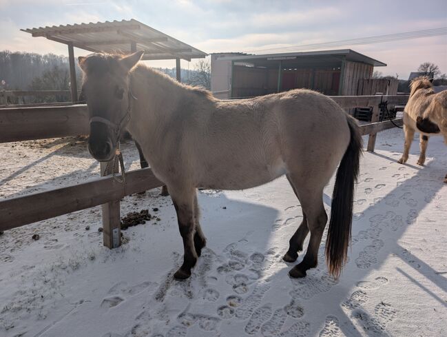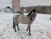 Manja sucht einen neuen Möhrchengeber, der ihr alles weitere beibringen kann. Sie ist eine bezaubernde Konik-Jungstute, geboren im Januar 2024. Diese charmante Silber-Graufalbe hat derzeit ein Stockmaß von 137 cm (gemessen), mit langen Beinen und einer sportlichen Statue. Sie stammt aus einer Sportkonik-Linie. Beide Eltern sind über 1.43m.