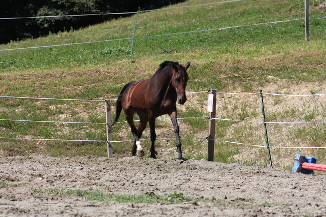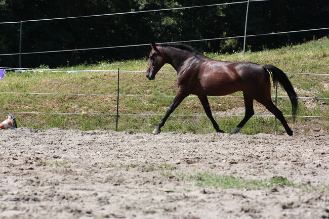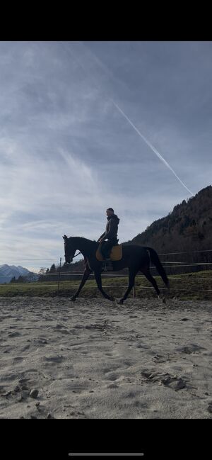 The mare is well-behaved, pleasant to handle and roadworthy. Riders find her to be pleasant to ride and fine on the aids. She is familiar with road traffic, trains, agricultural vehicles and various animals and is always calm. Her canter is currently being further consolidated and is reliable on a bent line.