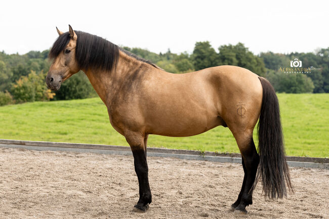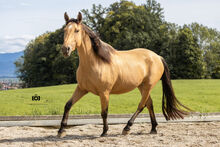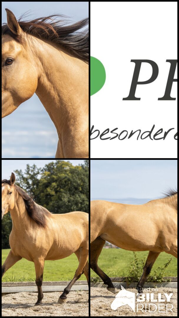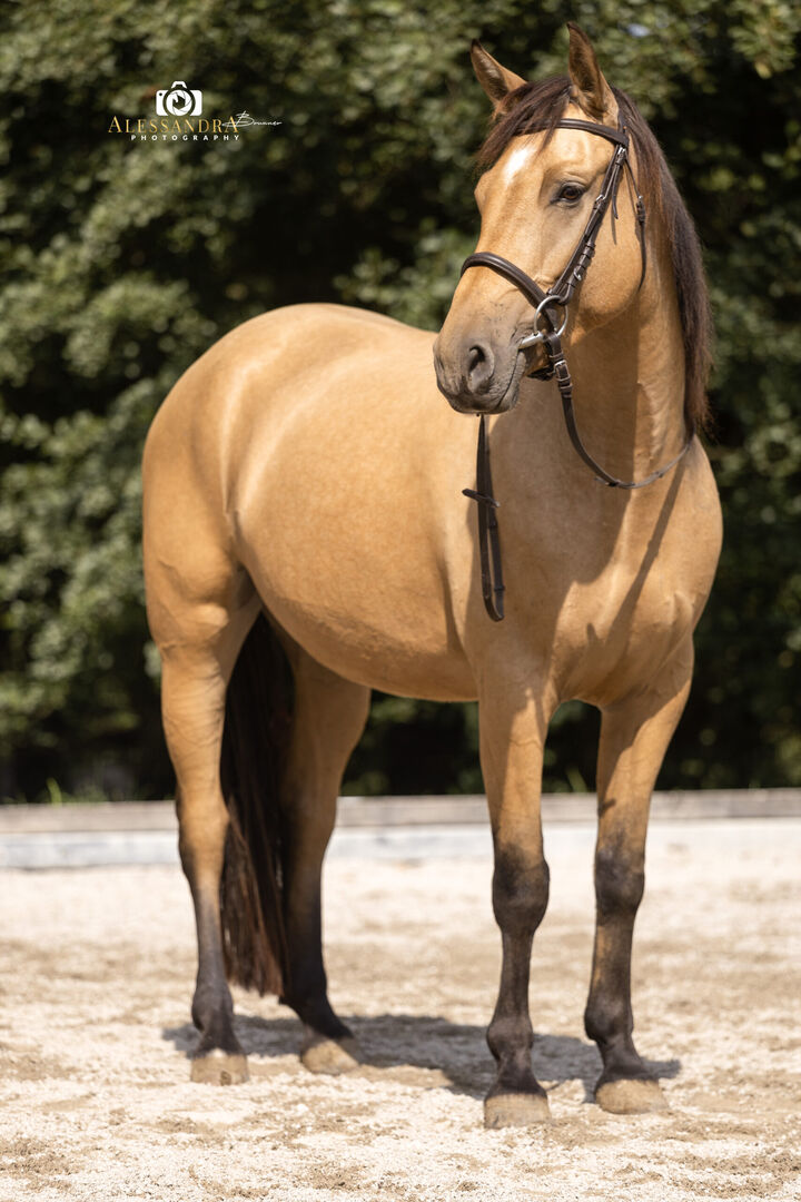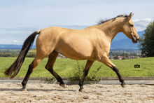 This charming dun mare comes from German breeding, was registered with the Bavarian Special Breeds Association as a "Spanish Sport Horse" and was awarded a prize as a foal. She therefore has full paperwork, which makes her valuable for breeding. The human contact from day one and the high-quality rearing clearly made themselves felt here and will pay off throughout her life. Martini has become a well-rounded personality who always acts thoughtfully, but still knows what she wants.