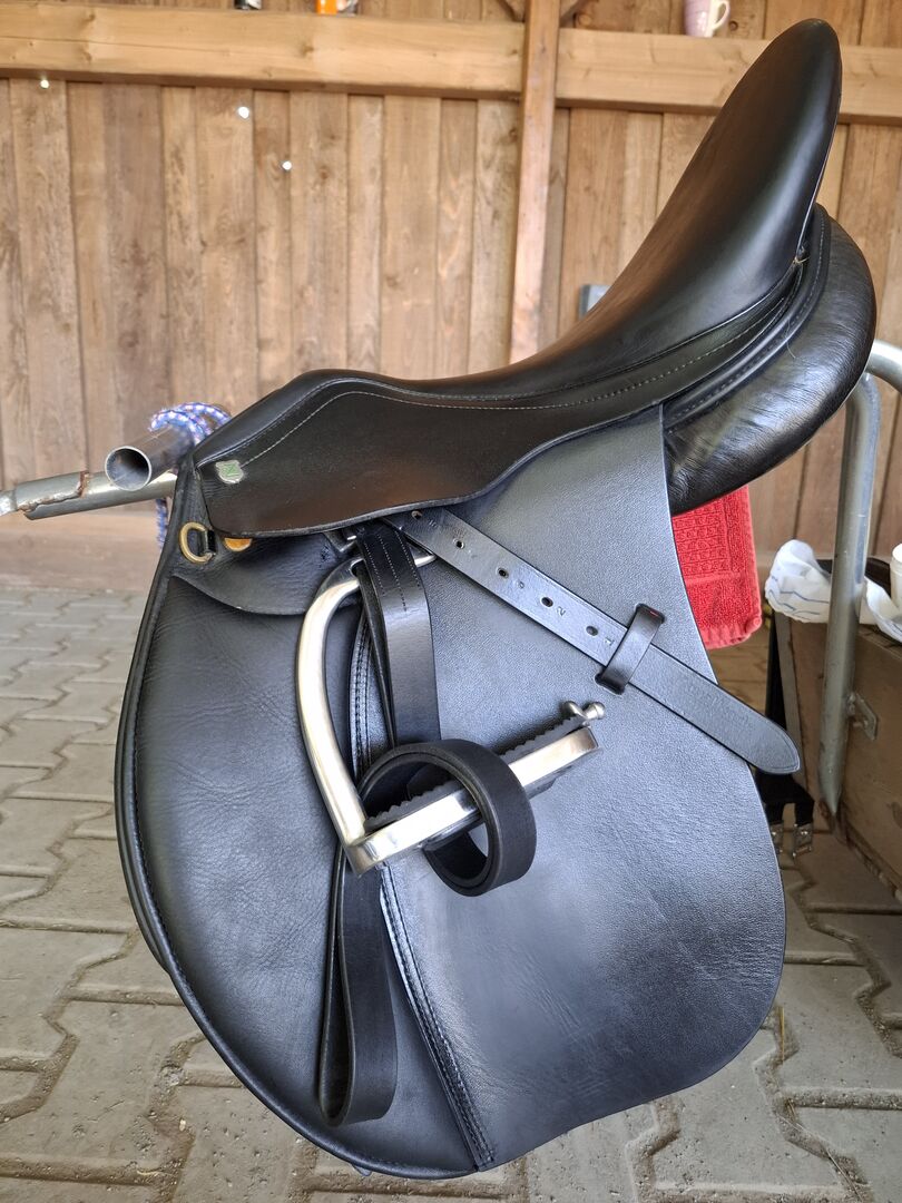 Massimo saddle - 17 inch , chamber width 35 , original chamber width 34 . French panels filled with wool . Suitable for very short horses . Was re-upholstered at the end of 2023. Stored dry and with saddle cover.