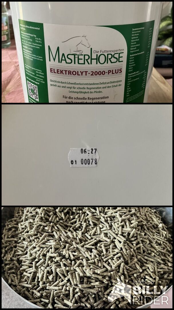 Masterhorse Electrolyte-2000-Plus 5kg bucket - Open 5 kg bucket (best before 06/27) with 3.5 kg feed (I weighed it out) for 30 euros New price: 58 euros (3.5 kg then converted to 40 euros) Shipping + 5 Euro Private sale, no guarantee Private sale, no guarantee