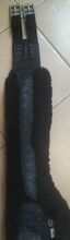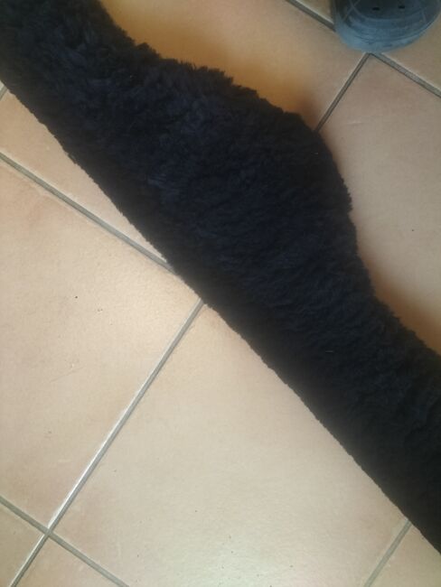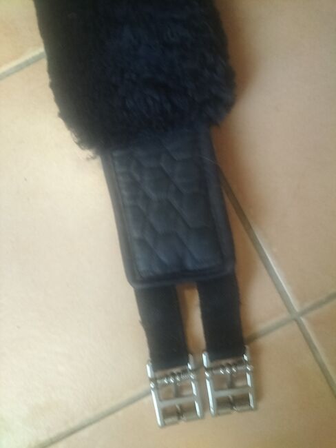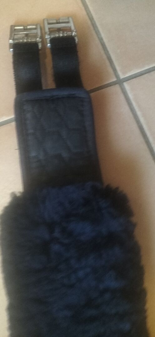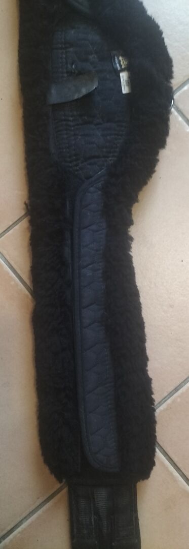 The girth has normal signs of wear. The girth and the lambskin are black.