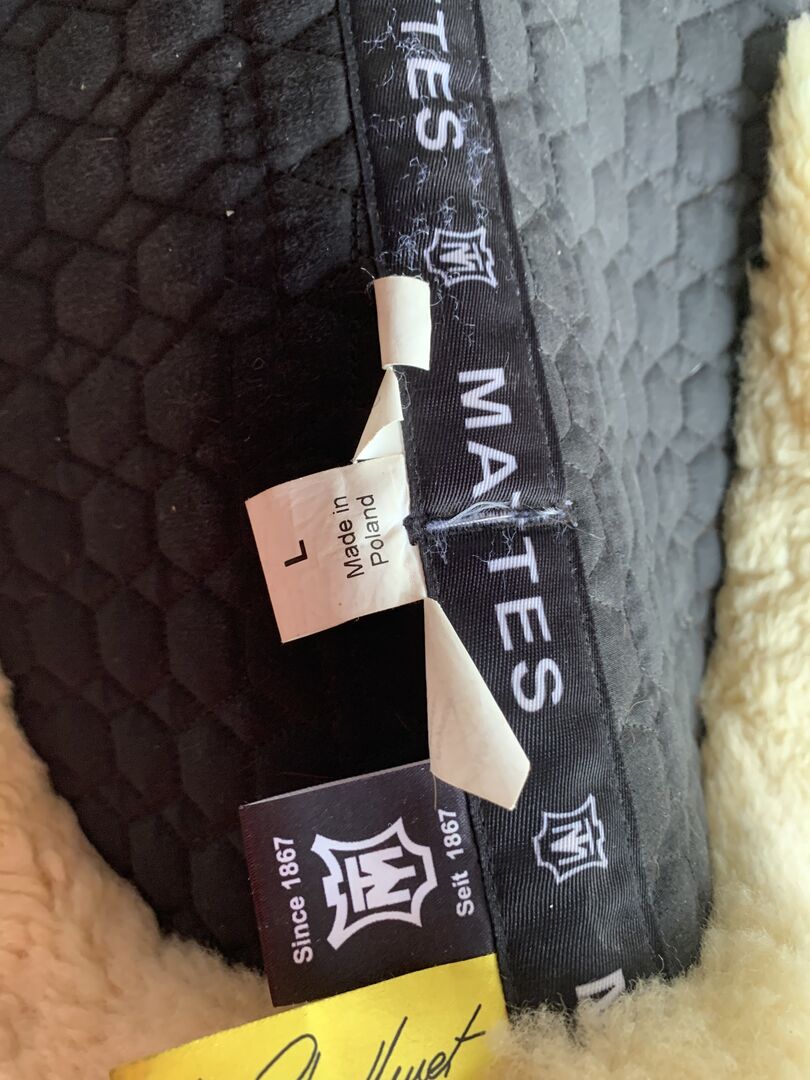 Mattes lambskin pad dressage size L with PM system - Very well preserved lambskin pad from Mattes in size L dressage with spine clearance. Thanks to the PM slot, the Velcro closure of the saddle pad underneath can be carried out.