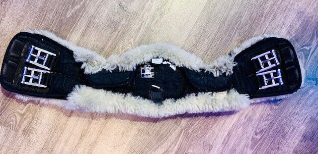 Mattes lambskin short girth size 60 cm - I offer a used Mattes lambskin short girth (moon girth) with beige-colored lambskin. The girth has been washed exclusively with lambskin detergent, so the fur is nice and fluffy (see pictures). The lambskin is removable and has self-closing roller buckles. The padding of lambskin provides relief, prevents slipping and prevents chafing and skin irritation. The special shape is for round horses with a short back, wide rib cage or a very narrow chest. The moon shape prevents the girth from slipping forward.