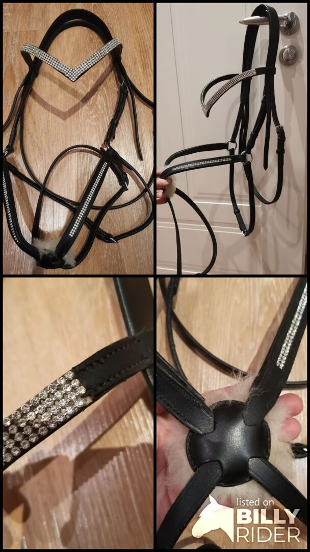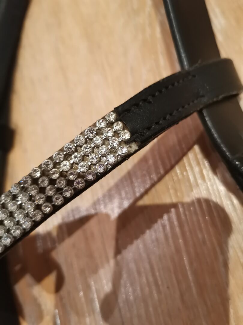 Mexican Snaffle - WB/Full - black silver - glitter - Offer a beautiful Mexican snaffle in size WB / Full. The bridle is made of super soft leather and buttery. The noseband has 2 rows of glitter, the centerpiece is lined with fur. The snaffle includes a pointed v-shaped browband with 4 rows of glitter. One stone is missing on the far left and one on the far right. Also included is a used and slightly curved browband with 4 rows of glitter.