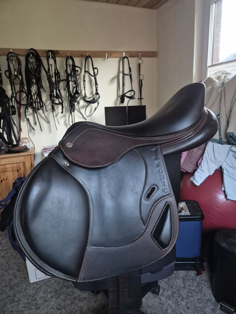 Mint Ikonic Cross pro Evolution 17'' - I am selling this absolutely new jumping saddle from Ikonic. It is the Cross Pro Evolution mono flap model. The size of the saddle is 17'' and the chamber width is currently MW. However, this can be changed independently with the Ikonic saddles. The saddle was manufactured in March of this year (2025), so it is really like new.