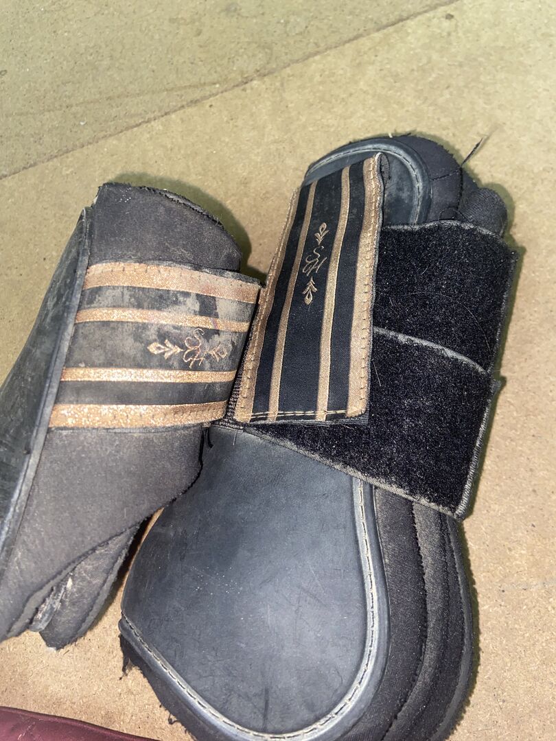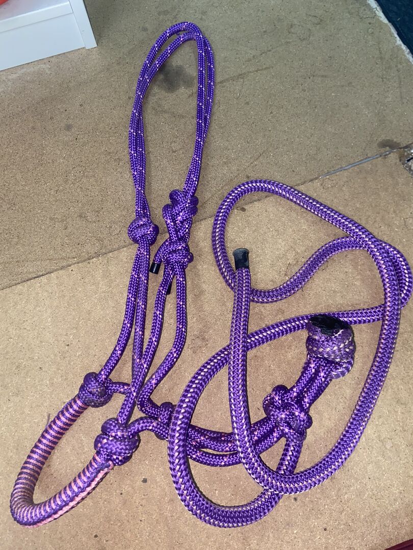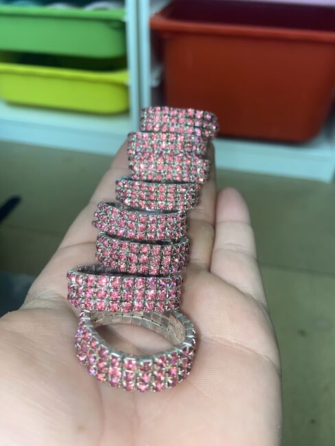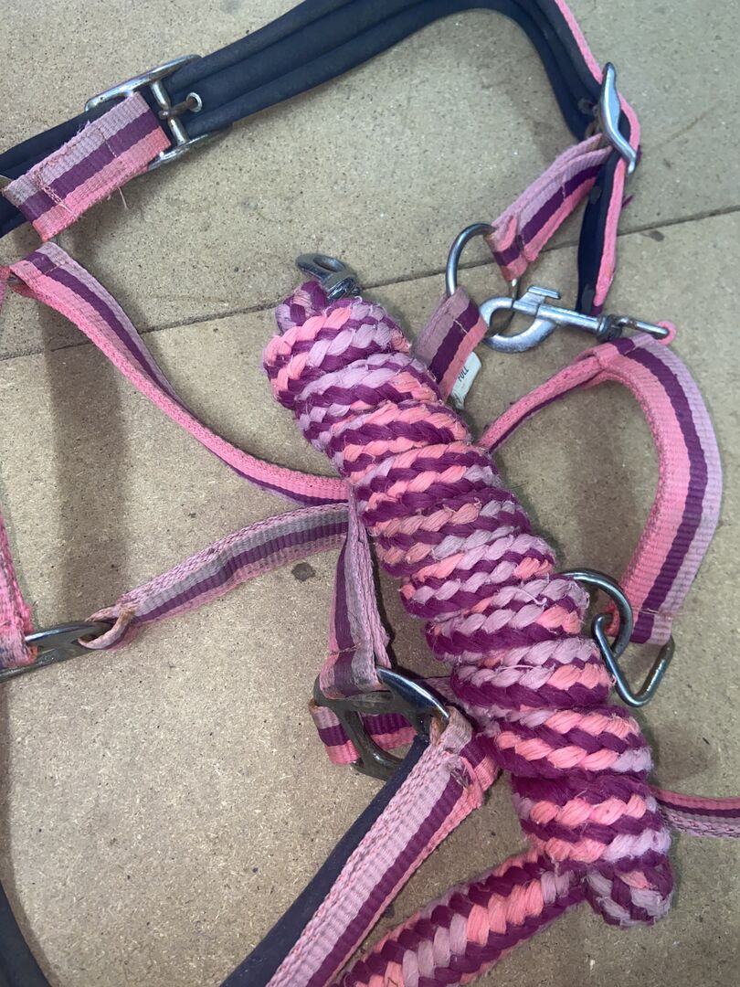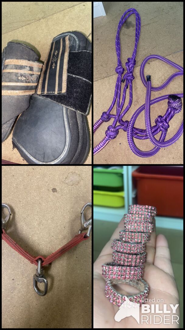 Miscellaneous accessories - Hello everyone, I am selling various horse accessories. On the one hand a halter in pink/pink/purple halter in size full with the matching lead rope without panic hooks. Also a purple knotted halter with matching rope which is unfortunately not removable. Then gaiters and fetlock boots in full and red lunging goggles and 8 glittered "rubbers" for the mane in pink, which are more suitable for thicker plaits, e.g. for shows. The prices are also different here.