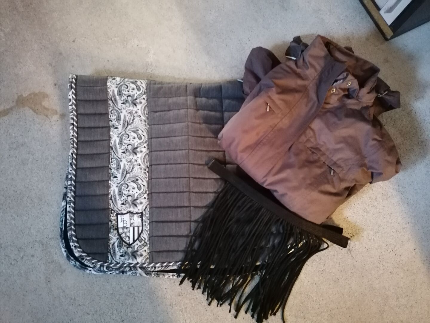 Sizes : T-SHIRTS S/M the blue one is L 10-20.- Jackets / Fibre : M 10-30.- pelmet the grey VS the red DR 25/30 snaffle is 14.5 25.- belt ca 80cm 20.- Riding boots black are agabe ofem foti (100.- cm)