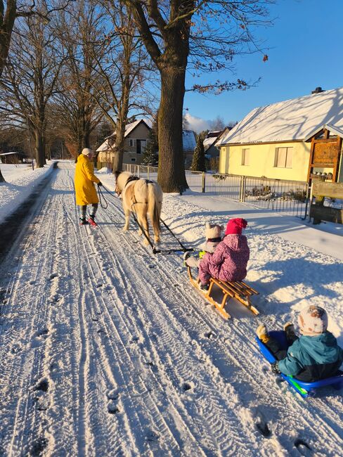 She is very versatile: ✨ Pulls sleighs and carriages well, even after a long time a short refresher is enough ✨ Runs reliably on the lunge line ✨ Side gaits in walk are already well established, with a nice underline ✨ Was only broken in a few years ago and is therefore still unused ✨ Also very well-behaved when riding ponies