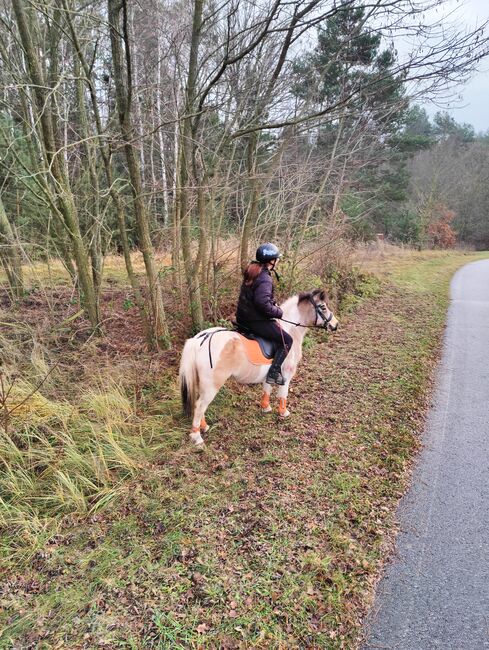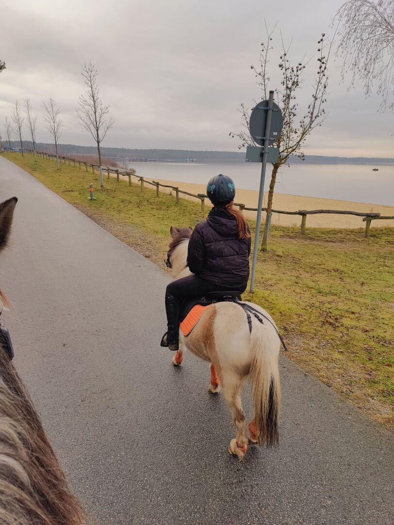 With a height of approx. 1.20 m, she covers small children and youngsters up to approx. 50 kg very well. She is ridden in all three gaits. She is still a little unsure in canter and occasionally bucks a little under the rider, which is mainly due to the fact that I cannot support and train her correctly because of my weight and size. However, with the right, gentle encouragement, she still has a lot of potential here.