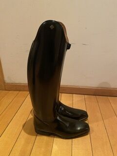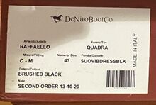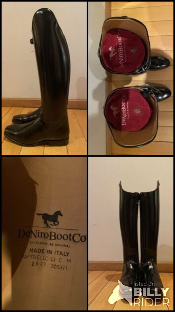 New and unused DeNiro BootCo "RAFFAELLO" dressage boots handmade in Italy. - Premium professional dressage boots crafted from high quality leather with elegant classical design, excellent leg support and refined finish. Condition: Brand new - never worn or used. Carefully stored in original packaging. Original DeNiro BootCo box and original boot bag included. Original retail price: 640 € (see photo). Details: - Brand: DeNiro BootCo - Model: RAFFAELLO - Handmade in Italy. - Colour: Brushed Black leather. - Toe shape: Quadra. - Rear zipper with protective strap closure. Size and fitting: - Size: EU 43. - Fitting: C-M (medium height and calf). Measurements approx: - Shaft height: approx 48 cm (see photo). - Calf circumference: approx 40 cm. Elegant straight dressage shaft providing excellent leg position and support. Perfect for dressage competition or professional training. Shipping: Shipping within Spain and Europe available. Boots will be carefully packed to maintain their shape during transport. Tracked and insured shipping at actual cost. Location: Spain. Price: 489 € - open to reasonable offers. Price set realistically according to condition and original retail value. Please compare measurements carefully before purchase.