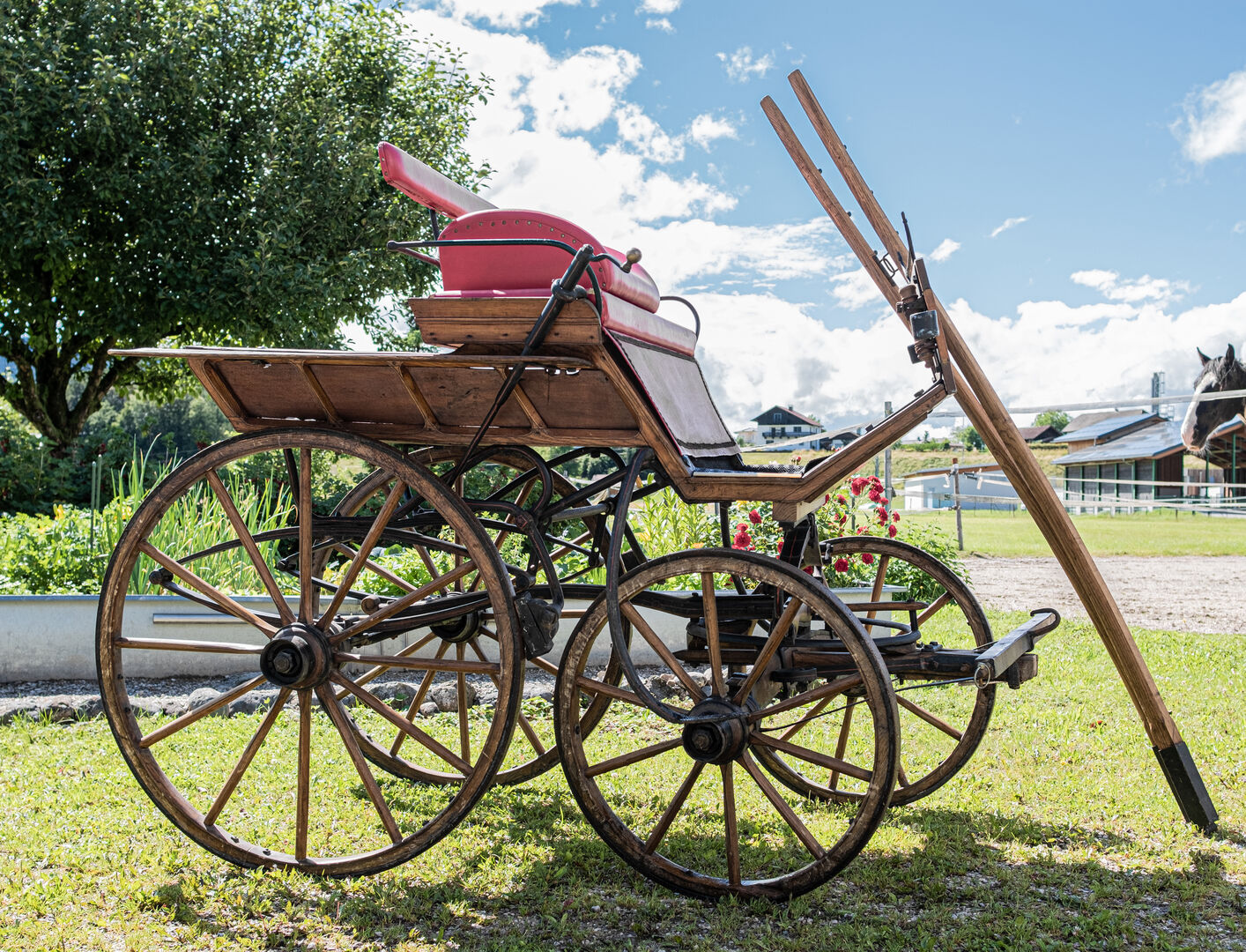 Nostalgic wooden carriage - Steirerwagerl from 1911 - PURE NOSTALGIA ! A sunny ride with this beautiful restored carriage (Steirerwagerl) from 1911, ready to drive for one or two horses (hitch and pole available), original wooden wheels with iron fittings and crank brake. Restored years ago with great attention to detail.